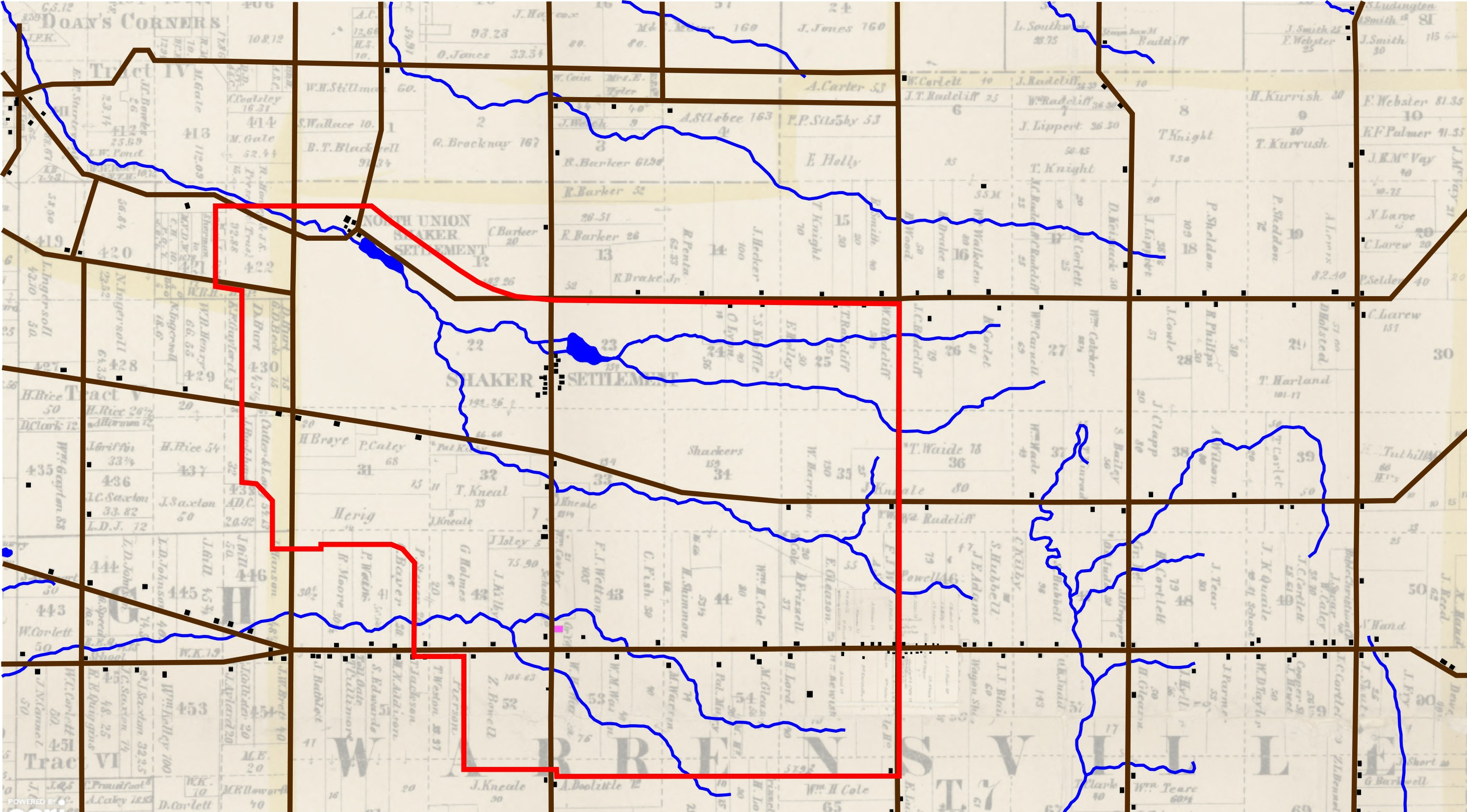 Shown above is the original map of 1858 with the opacity reduced. The existing structures are then outlined as small black rectangles, the water features of the time are traced in blue, and existing major roads are drawn in brown. The area show in red is the outline of Shaker Heights in 1922.