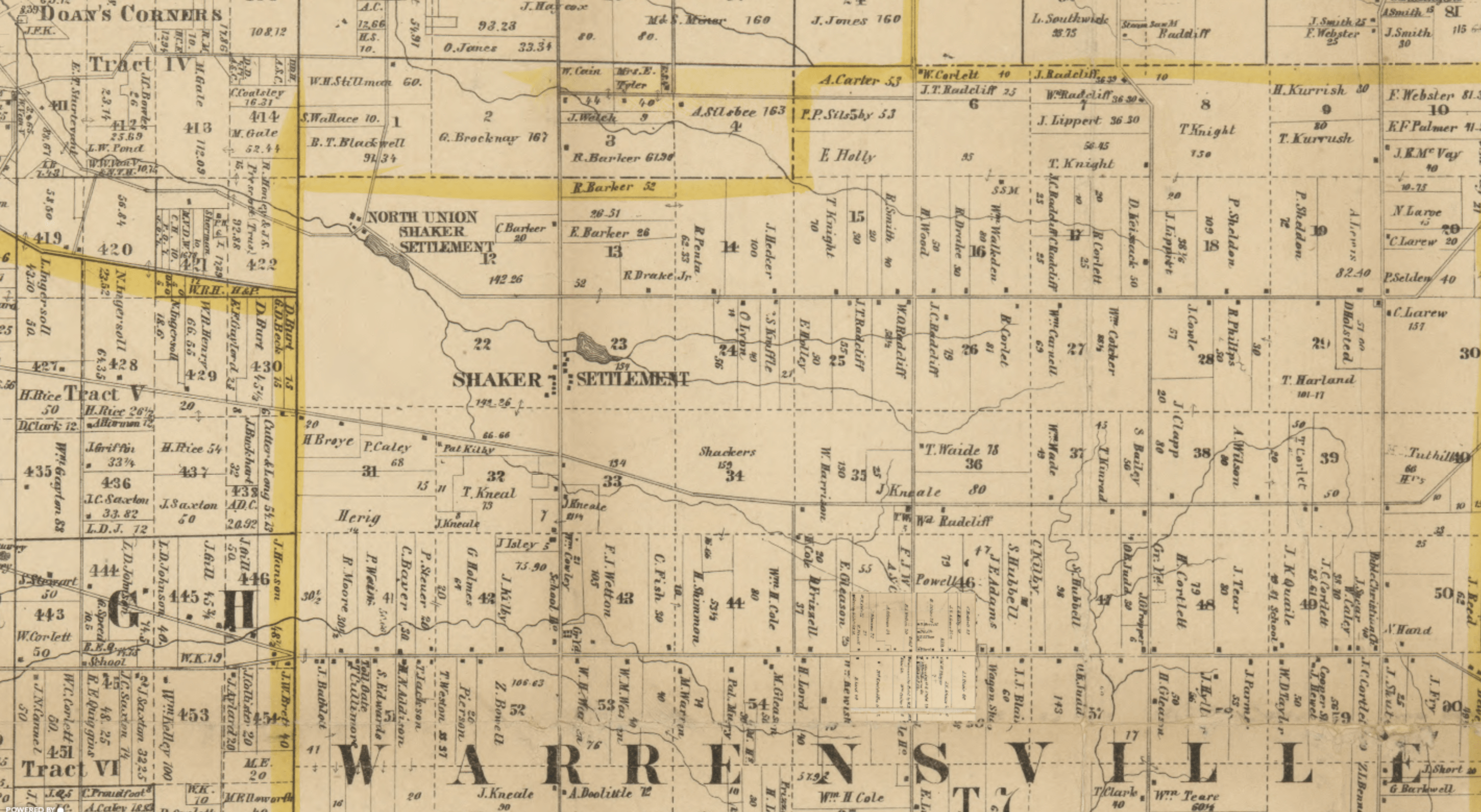 Ralph Russell established the North Union Shaker Settlement in 1822 with just over 80 individuals. Between 1826 and 1854, the group dammed Doan Brook (shown in the image above), which made Upper and Lower Lake, and established three grist-mills and a sawmill. The colony peaked around 1850 with around 300 settlers. By 1889 the congregation had dwindled, causing the colony of North Union to close. The remaining Shakers were then relocated to colonies in southern Ohio.