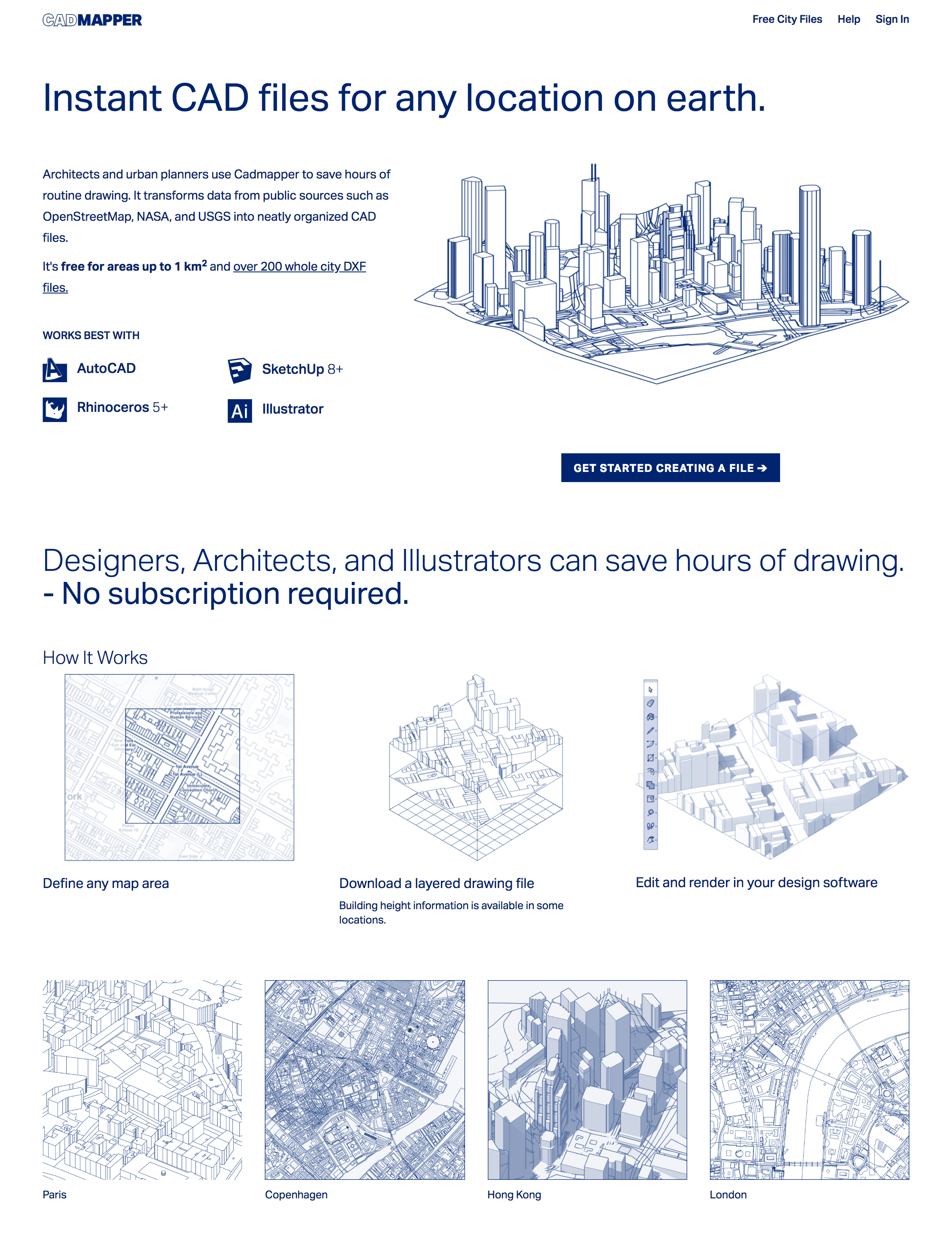 A site that then uses this data is Cadmapper. Cadmapper provides free downloadable 2D and 3D files up to 1 km2. If you want to download a larger area you are charged a fee. The downloadable formats are AutoCAD, SketchUp, Illustrator, Rhino, or (.DXF).