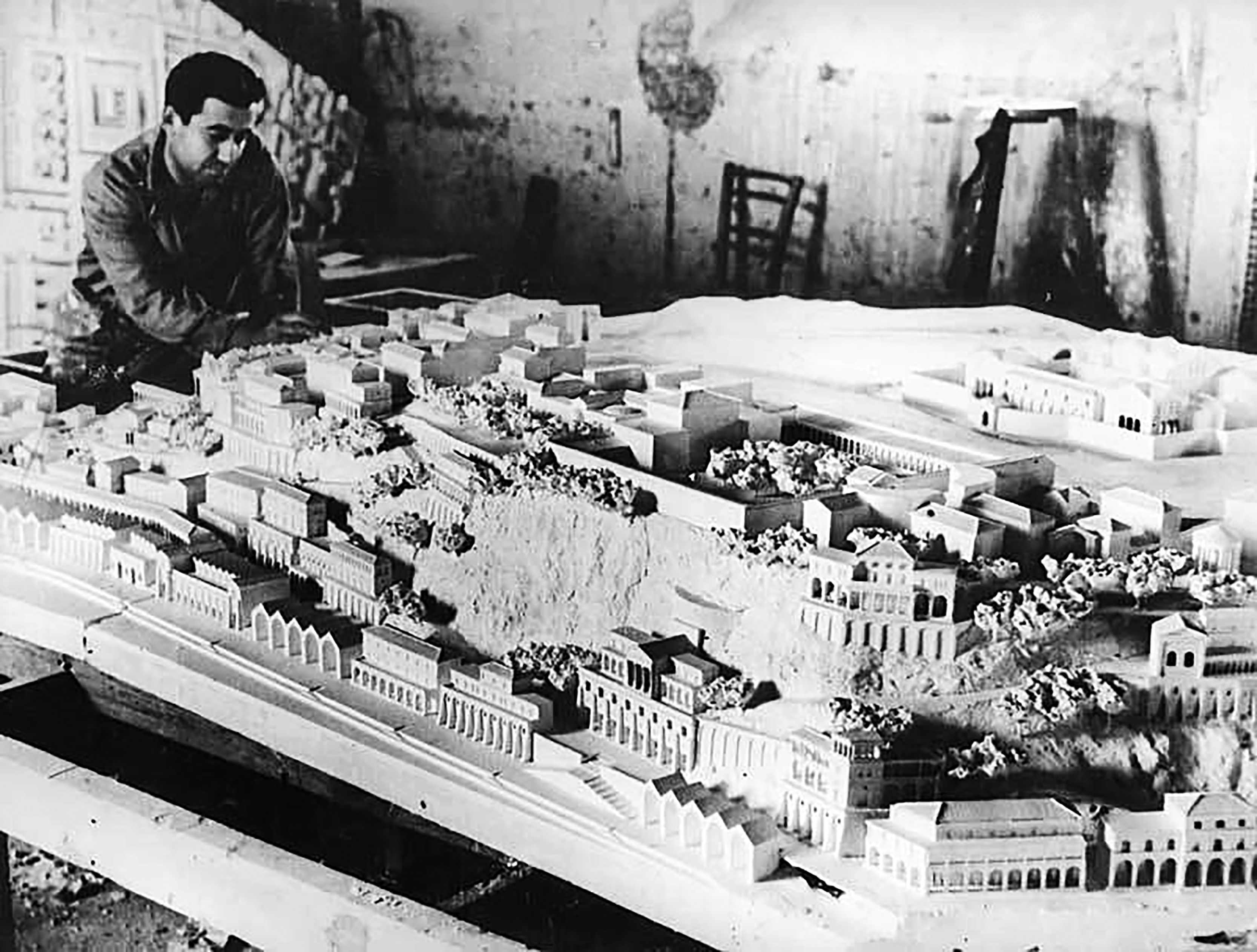 Another early example is the architectural model of Ancient Rome. Built circa 1934 by model maker Piero di Carlo, the model is housed in the Museum of Roman Civilization, in the suburb of E.U.R. just south of Rome. The sizeable model is viewed from above and is housed in a large room.