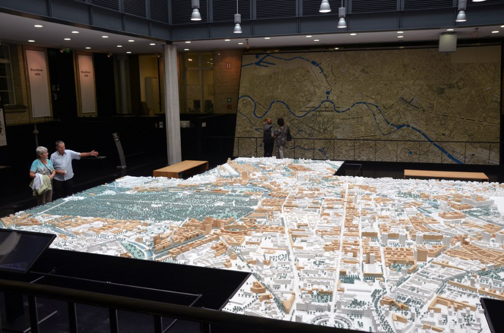 During the 1990’s reconstruction of unified Berlin a large-scale model was built to show the existing structures versus the new, shown in a darker material.
