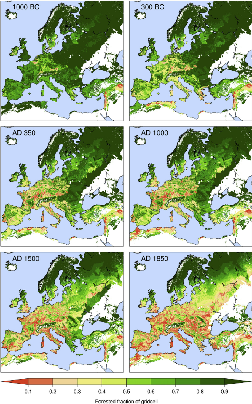 In the series of 6 images shown below you see how the landscape has changed via deforestation over time, from 1000BC – 1850AD.
