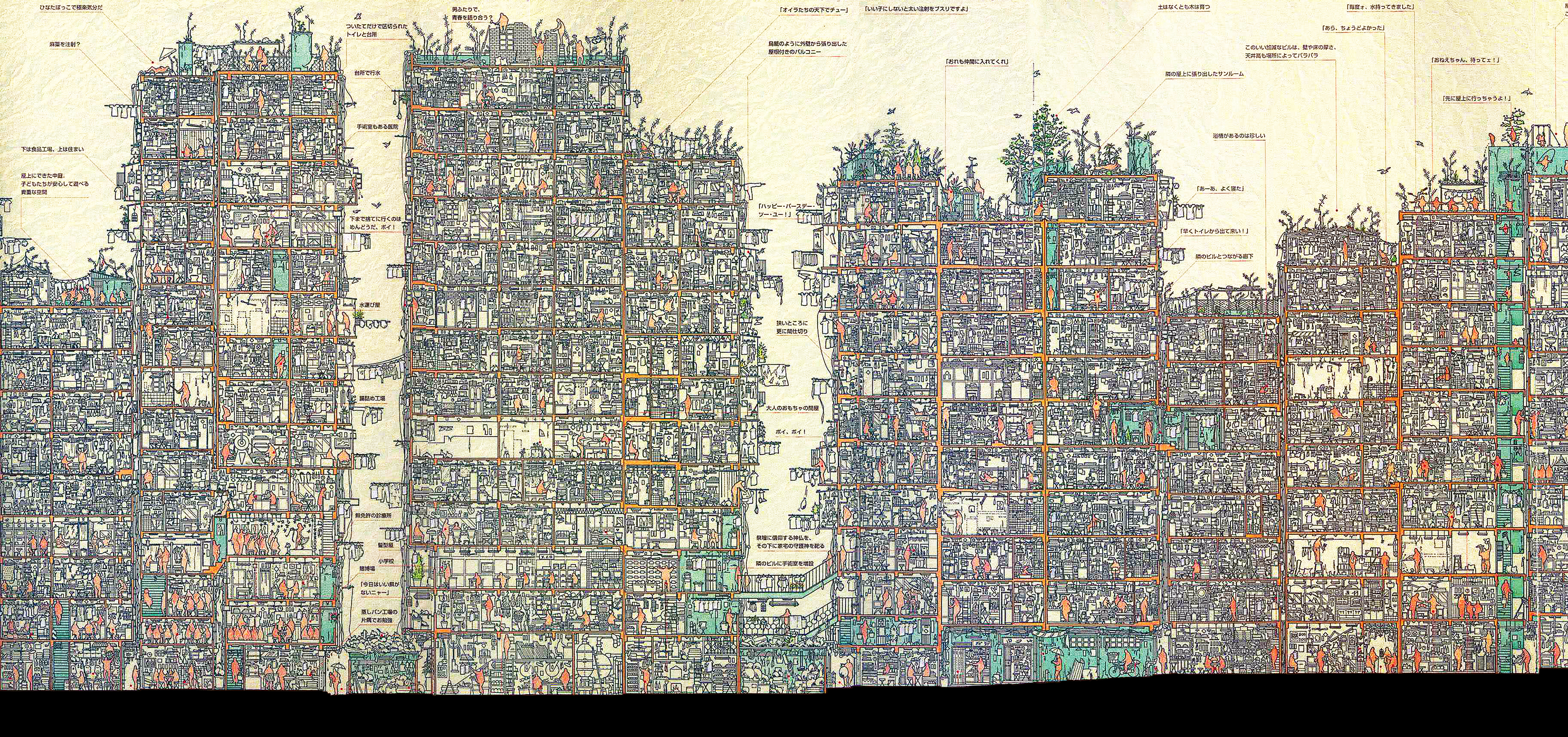 One example is Kowloon Walled City, once located in Hong Kong, and now demolished.