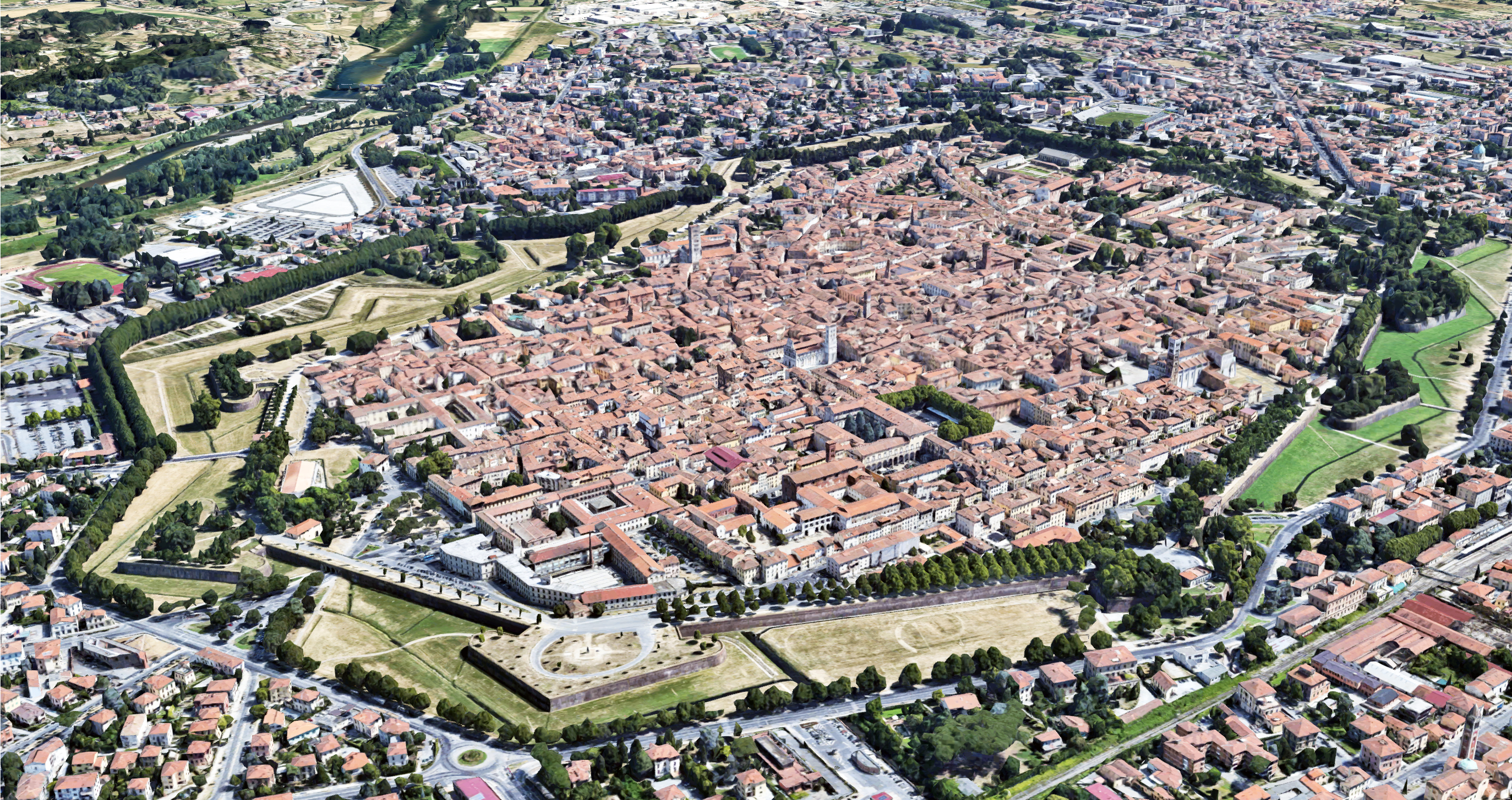 The enclosed edge is typically a wall left over from times past, and today are generally a tourist attraction. Lucca, Italy is a perfect example of a fortified city. The walls built in the Renaissance era still stand today. The area around the walls is generally cleared to fire upon invading troops. Today this area surrounding Lucca is a park.