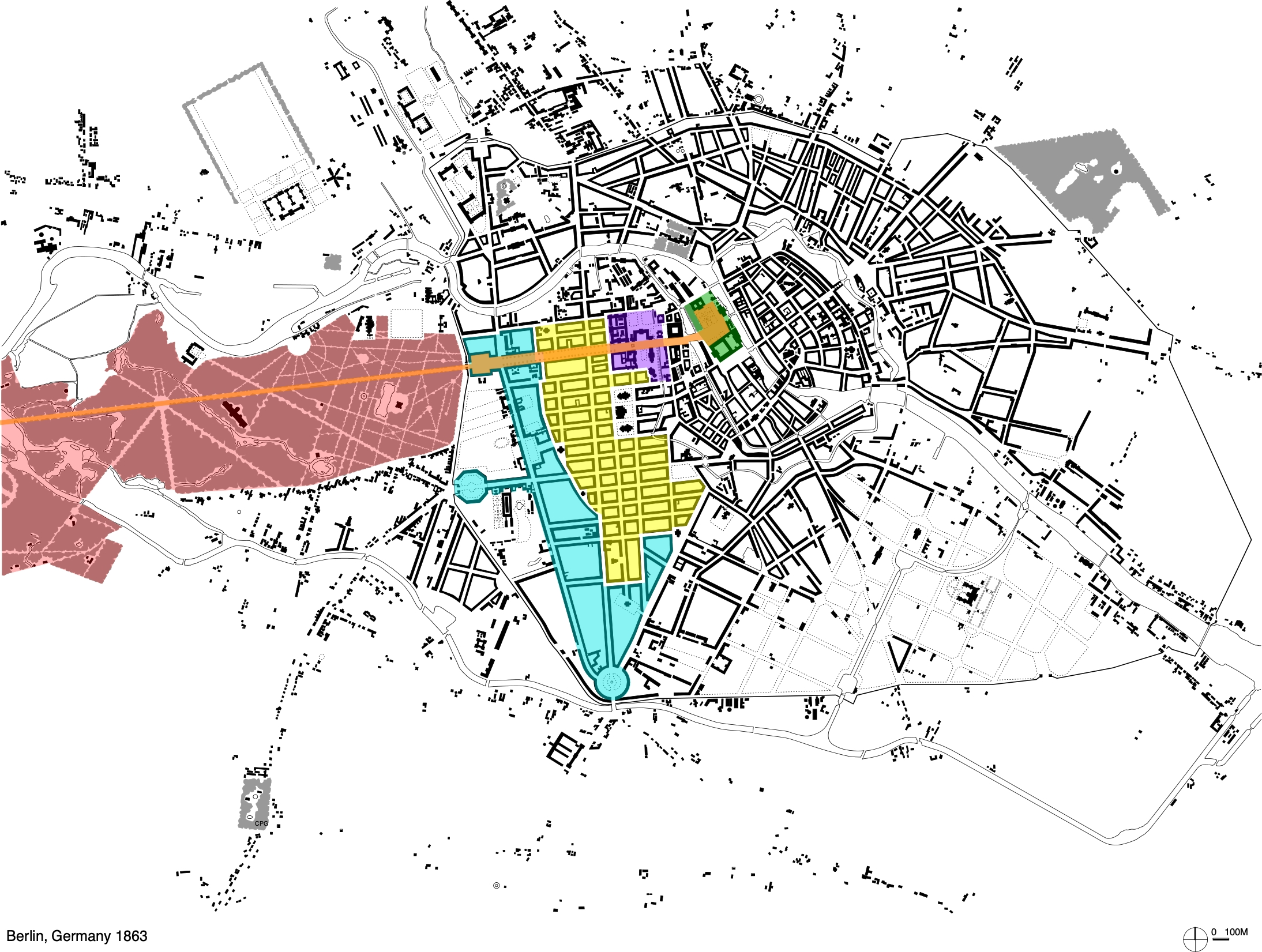 Above is the city plan of Berlin, Germany 1863, with a number of fields depicted. Note the orange zone of Unter den Linden & Bundesstraßerunning through the Tiergarten. Together these two fields connect the various fields shown.