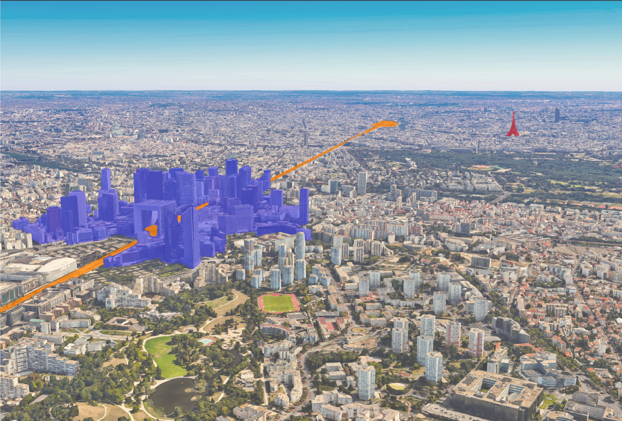 The area highlighted in blue is the area of the Grande Arche de la Defense. The orange stripe is the extension of the Avenue des Champs-Élysées, which begins near the Louvre, and ends at the Arc de Triomphe. The avenue then turns into the Avenue de la Grande-Armée, followed by the Avenue Charles de Gaulle, which then intersects the Grande Arche de la Defense. Off to the right, and shown in red, is the Eiffel Tower.