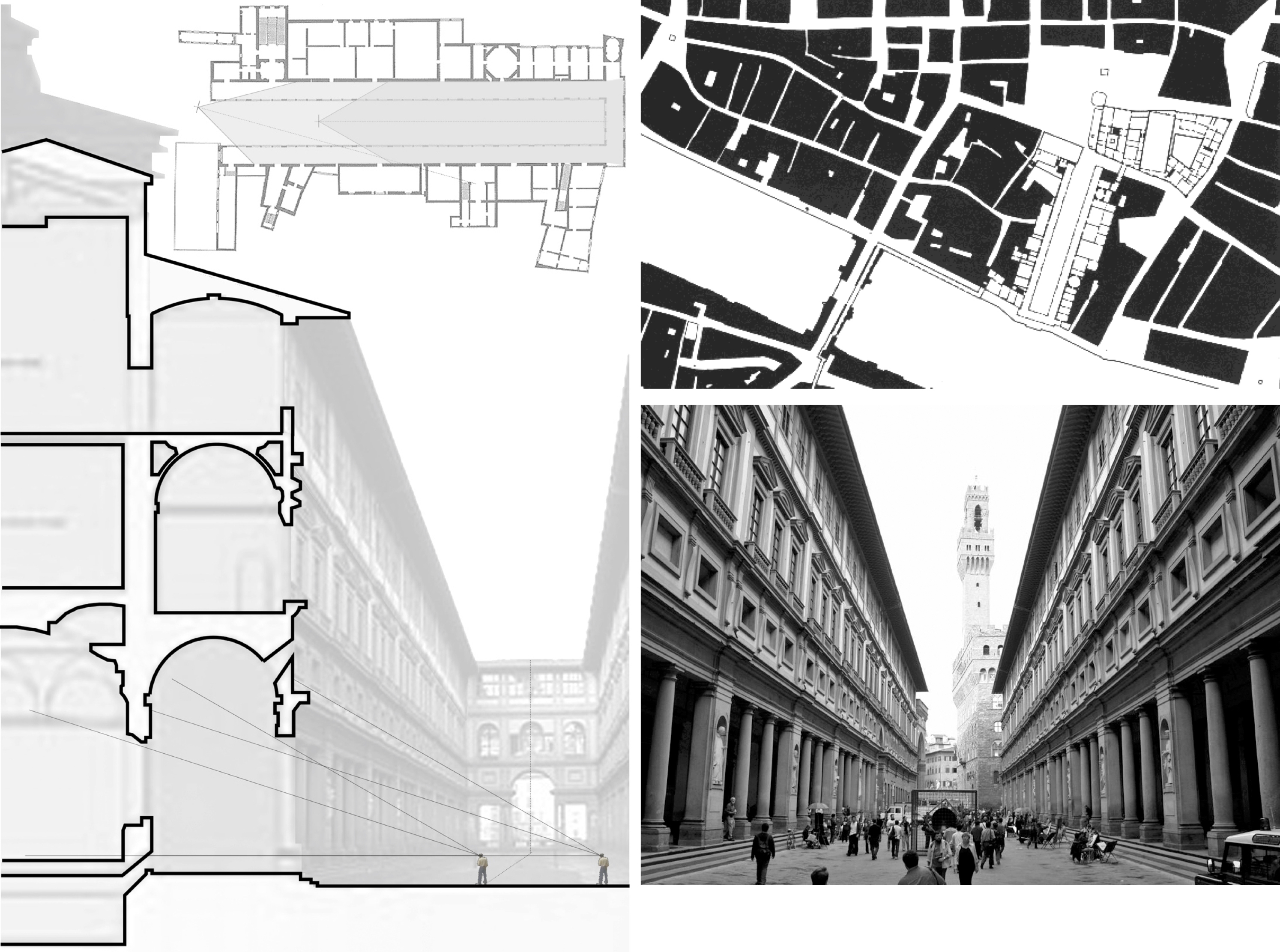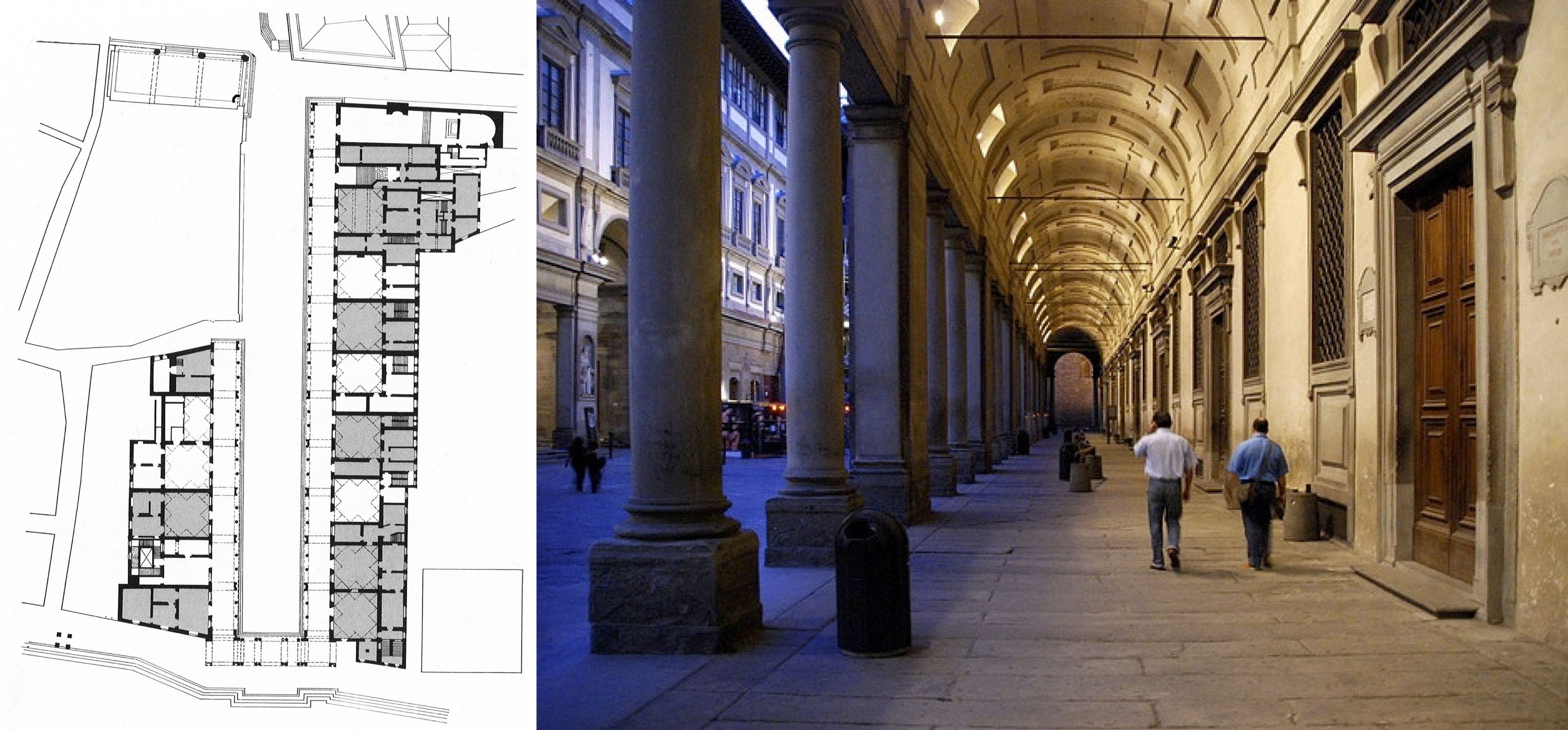 Another aspect of the Uffizi is the loggia. The archetype of the loggia, meaning an open-sided roofed or vaulted gallery that is either freestanding or positioned along the side of a building, proved to be an effective device for mediating between severe office architecture and its surroundings.
