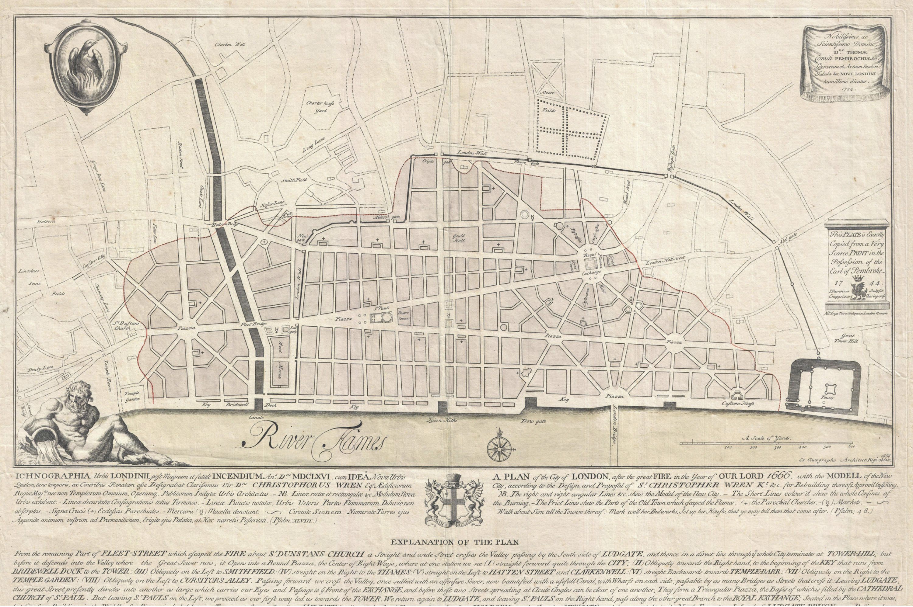 In 1666, after the great fire of London, and within a few days of the fire’s end, Christopher Wren submitted plans to Charles II for the complete rebuilding of the city. Similar to the long axes found in Vaux-le-Vicomte & Versailles, Wren’s grand scheme called for cutting wide avenues through the former maze of alleys and narrow roads that had made up old London. His proposal would open up the city to light and air. King Charles liked the scheme, but he realized the expense and the necessity of rebuilding the burnt-out areas as fast as possible made it the scheme unworkable.