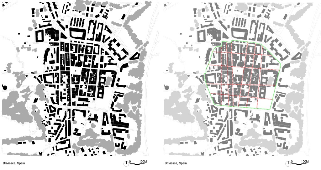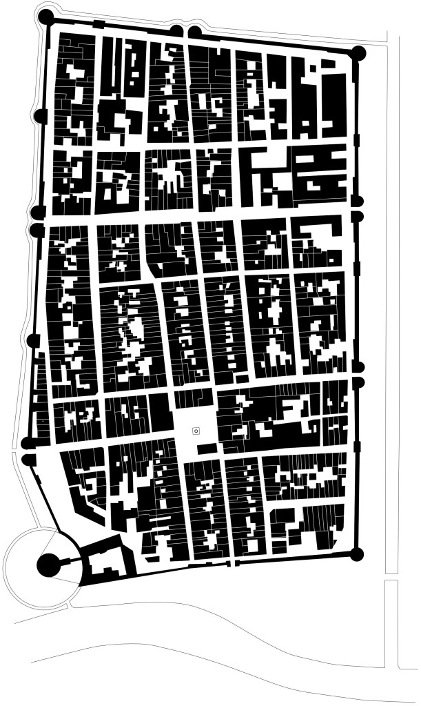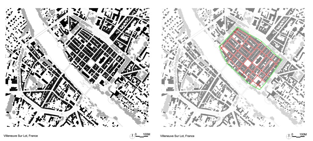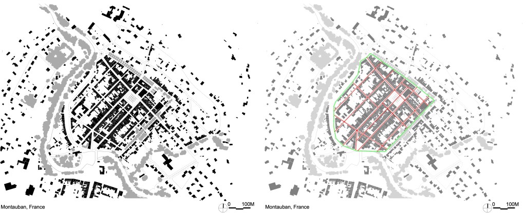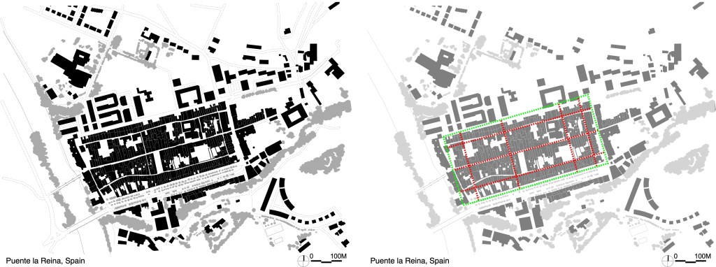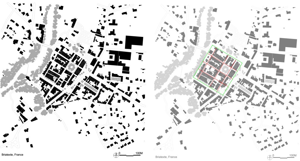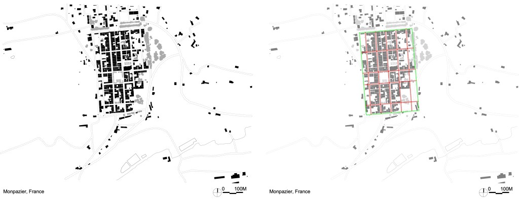 The following are a series of figure ground drawings illustrating plans of medieval new towns throughout Europe. I do not plan to go into the political history of the area, or why the cities were actually created. I’ll referyou to variousreadings if you’d like to do further research into the subject. What I will do, after I illustrate all the plans I’ve drawn, is to discuss some of the various repetitive conditions I’ve noticed during my research. I’m also supplying accompanying analysis, and possible earlier maps of the cities, along with some photos I’ve discovered that either show an aerial view of the urban center, or a photo of the major town square.