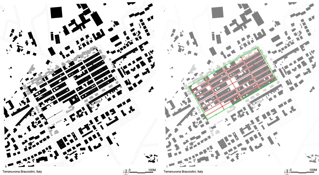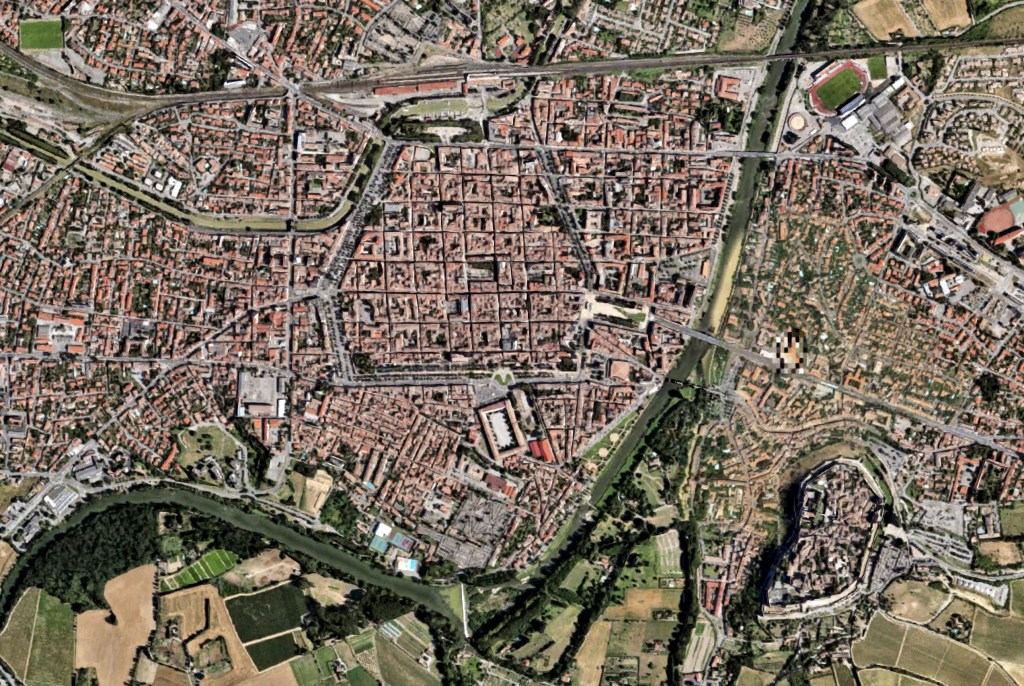 The actual rectilinear form was not always followed as a strict guideline though. The layout did not always follow a true north/south grid, and at times, due to either building on an existing town or an uneven layout of the land, the town structure would appear almost amorphous shape. As shown in the illustration of Como, the town conforms to the water edge, and as shown in the illustration of Arezzo, in some cases an arises due to the layout of the land.