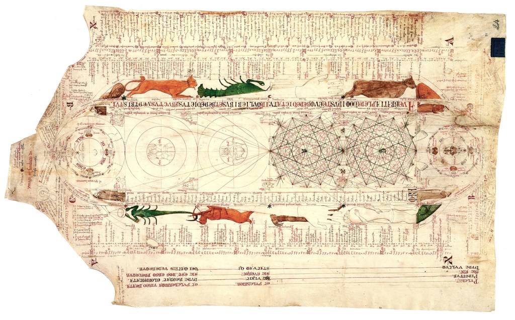 In chapter 6: The use of geometry in the design of new town plans in the high-period of town foundation, W.N.A Boerefijn goes in-depth analyzing all the different hypothesis on how medieval new towns were laid out. Without repeating his thesis here, I highly recommend you at least read this chapter. I will mention that he discusses the geometric diagram shown center right in the Opicinus de Canistris.