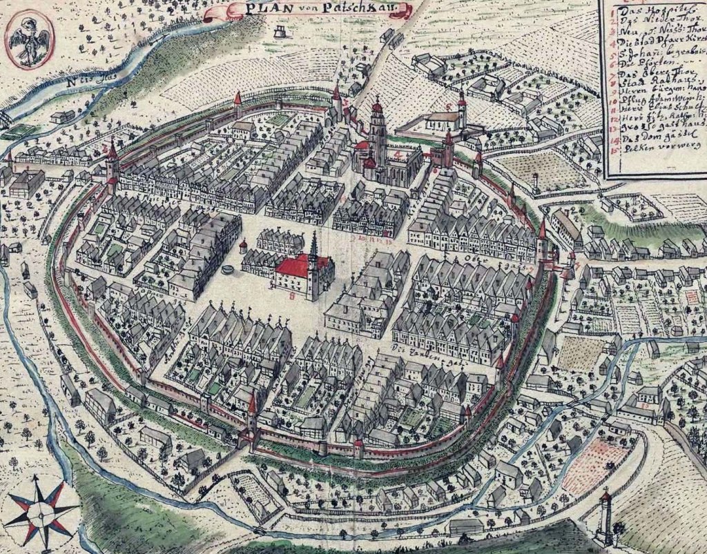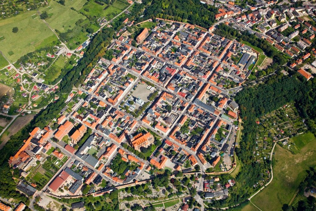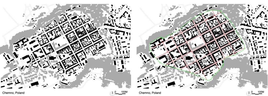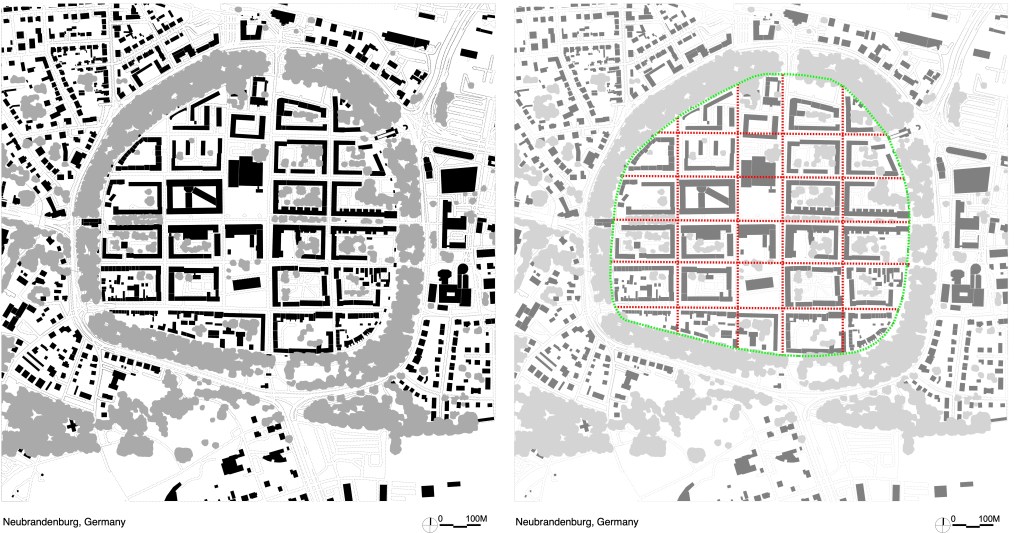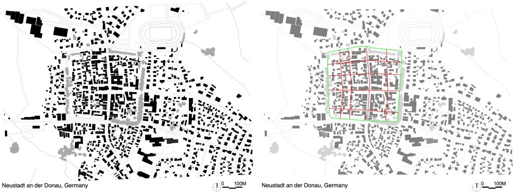 “In most of the plans of newly founded towns of the period, one can recognize an inclination towards regularity and orthogonality. It is obvious that there must have been a very basic idea of geometrical order behind this, involving straight lines, right angles, equality of distances and often even symmetry. Some scholars believe that plans which are more or less regular have been laid out by use of very simple geometry, by setting out straight boundaries at regular distances that were determined as rational, mostly rounded, numbers of the then current units of measurement. This is called ‘arithmetic design’ or ‘simple geometric design’. Scholars have tried to reconstruct specific cases of this method of design on the basis of measurements taken from specific town plans (either in reality or in more or less accurate plans on paper).