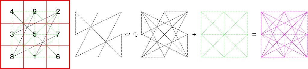 In ancient China the Hung fan, or the ‘Great Plan’, specified the five elements and the five numbers which the (mythical) dynastic emperor Yü received from heaven. Yü then measures and the divides the earth into nine regions, or one square divided into nine sections. This diagram underlies much of Chinese divination and remains a staple of Chinese surveying town plans.