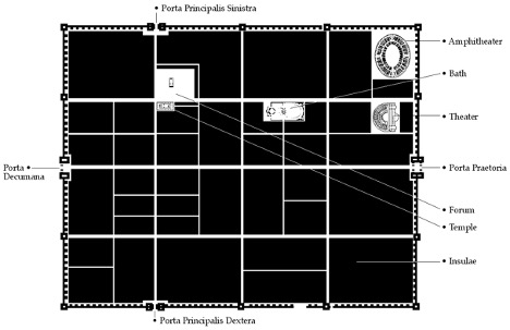 Too fully understand the mentality towards the layout of Roman legion towns it is important to understand the symbolism of their beliefs. The Romans, as early as the Etruscans, believed that the heaven was divided into four parts by two axes crossing each other at right angles. The diagram for this division was called templum in Latin. The two main intersecting lines were oriented towards the four cardinal points, with the north south called cardo and the east-west lines the decumanus. A city conceived and laid out according to the templum was not considered an ordinary place, but was considered sacred, and any city built was done so along these sacred principles.[5]