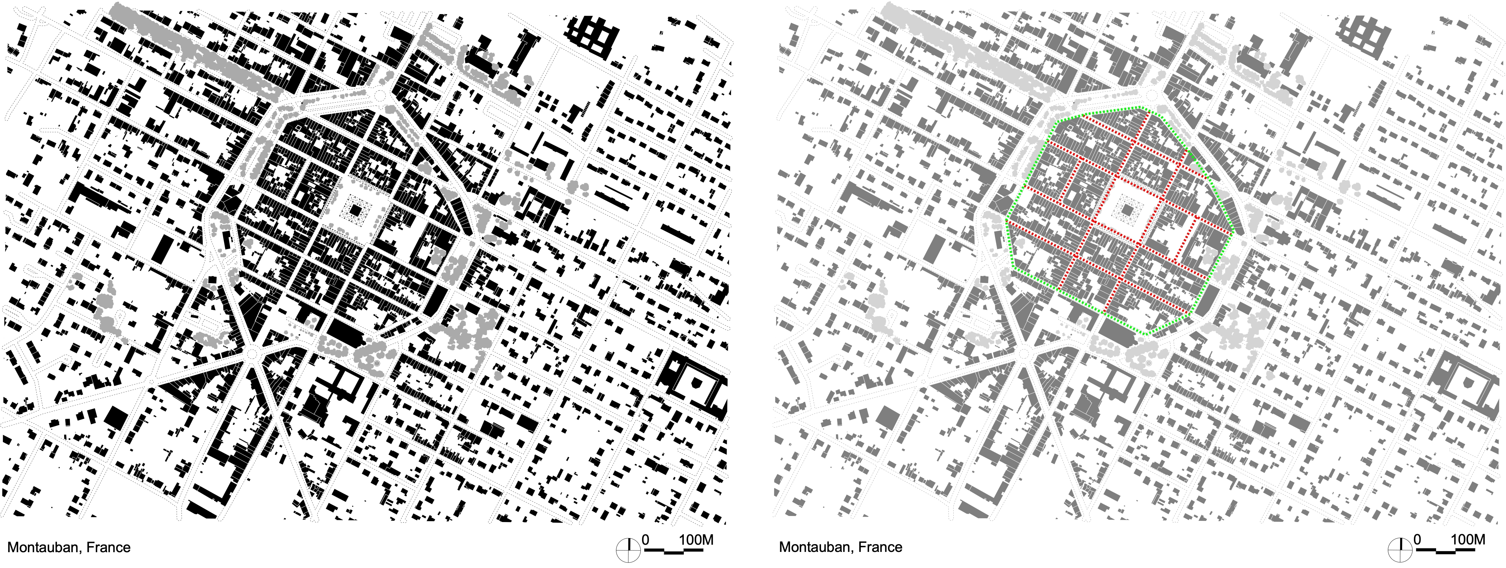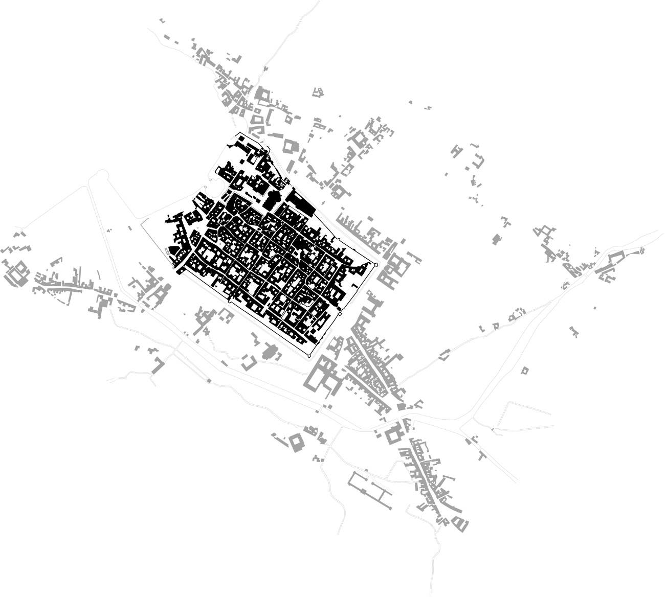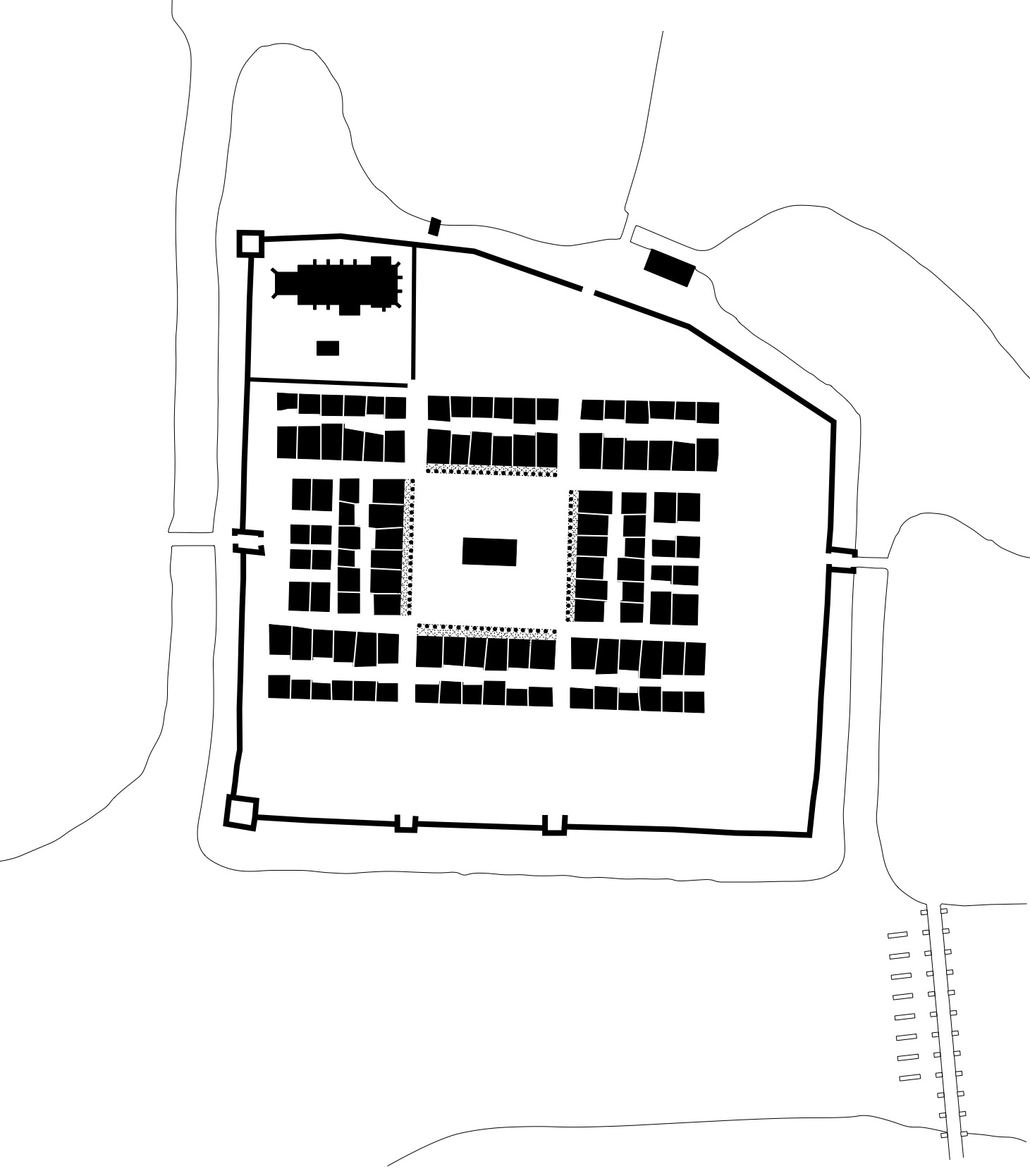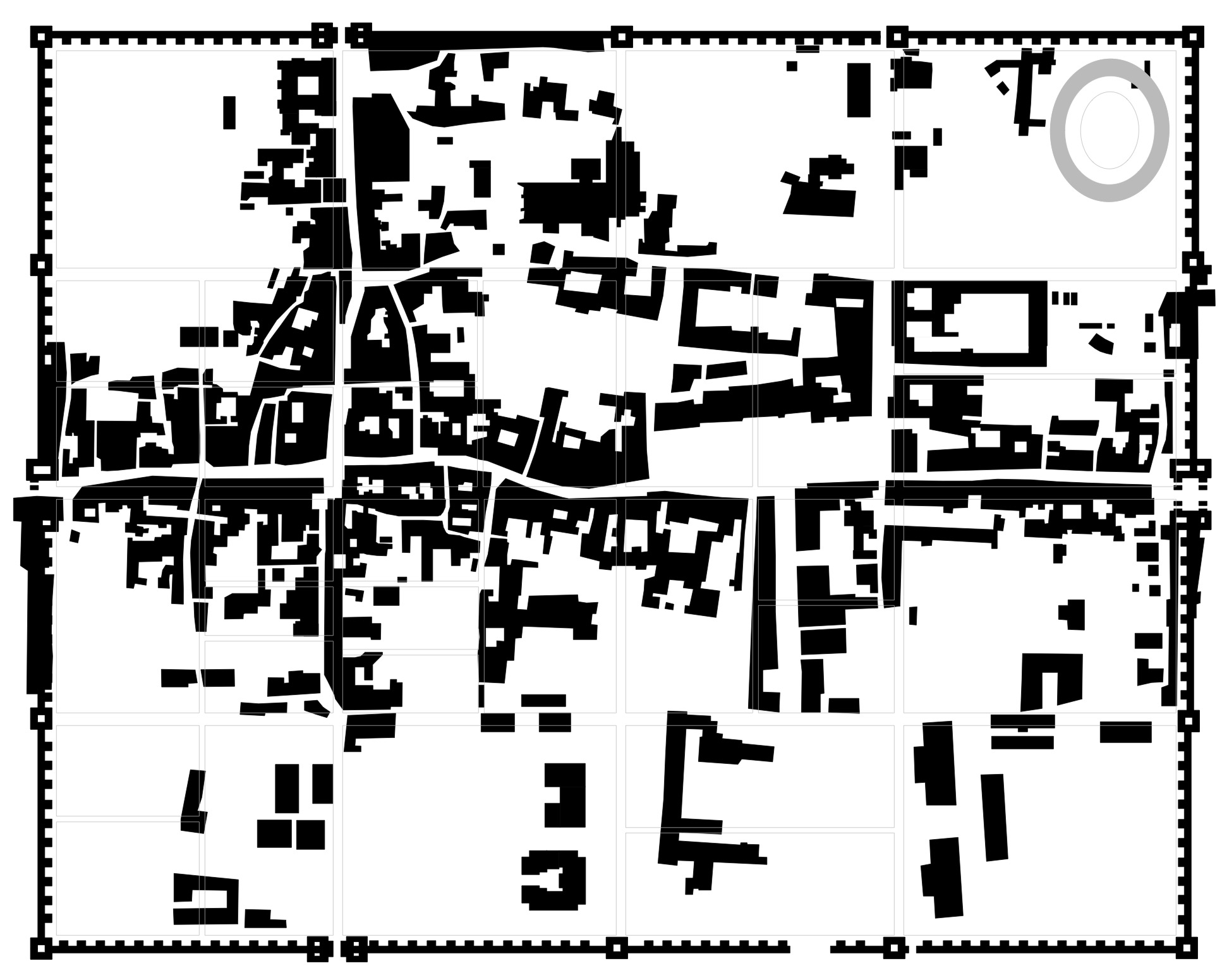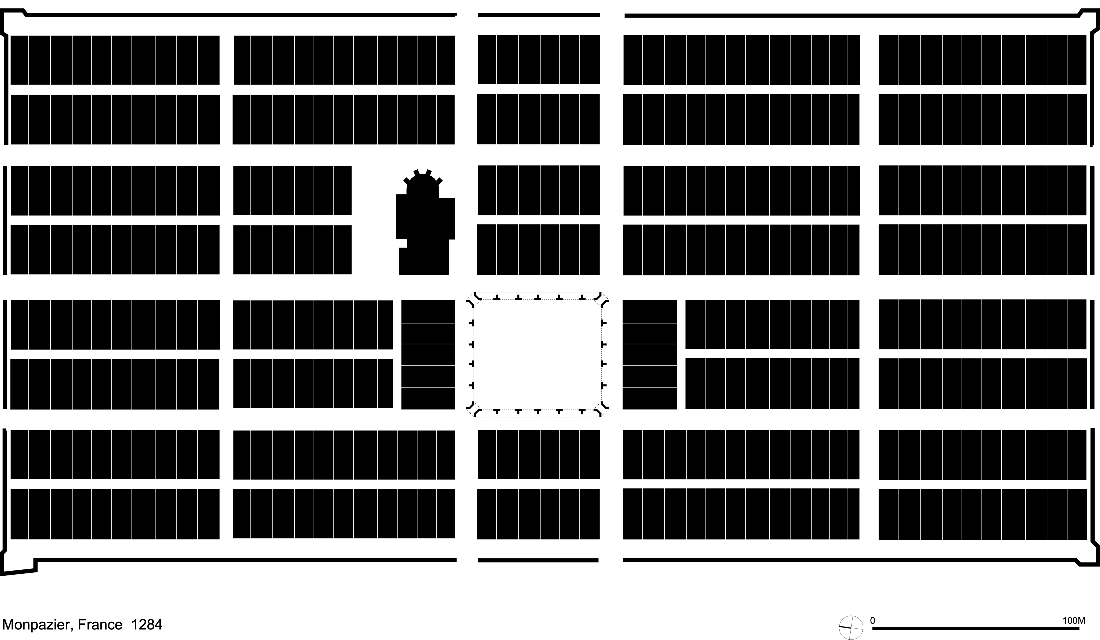 The following are a series of figure ground drawings illustrating plans of medieval new towns throughout Europe. I do not plan to go into the political history of the area, or why the cities were actually created. I’ll referyou to variousreadings if you’d like to do further research into the subject. What I will do, after I illustrate all the plans I’ve drawn, is to discuss some of the various repetitive conditions I’ve noticed during my research. I’m also supplying accompanying analysis, and possible earlier maps of the cities, along with some photos I’ve discovered that either show an aerial view of the urban center, or a photo of the major town square.