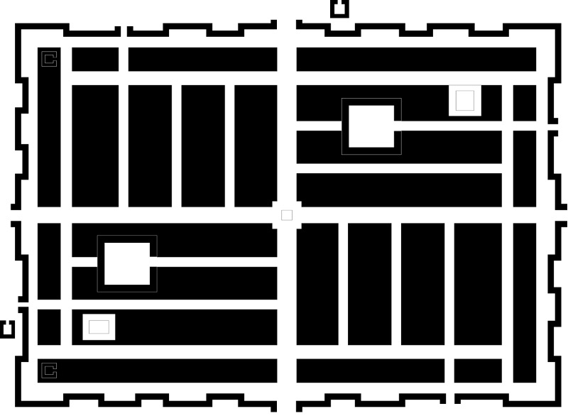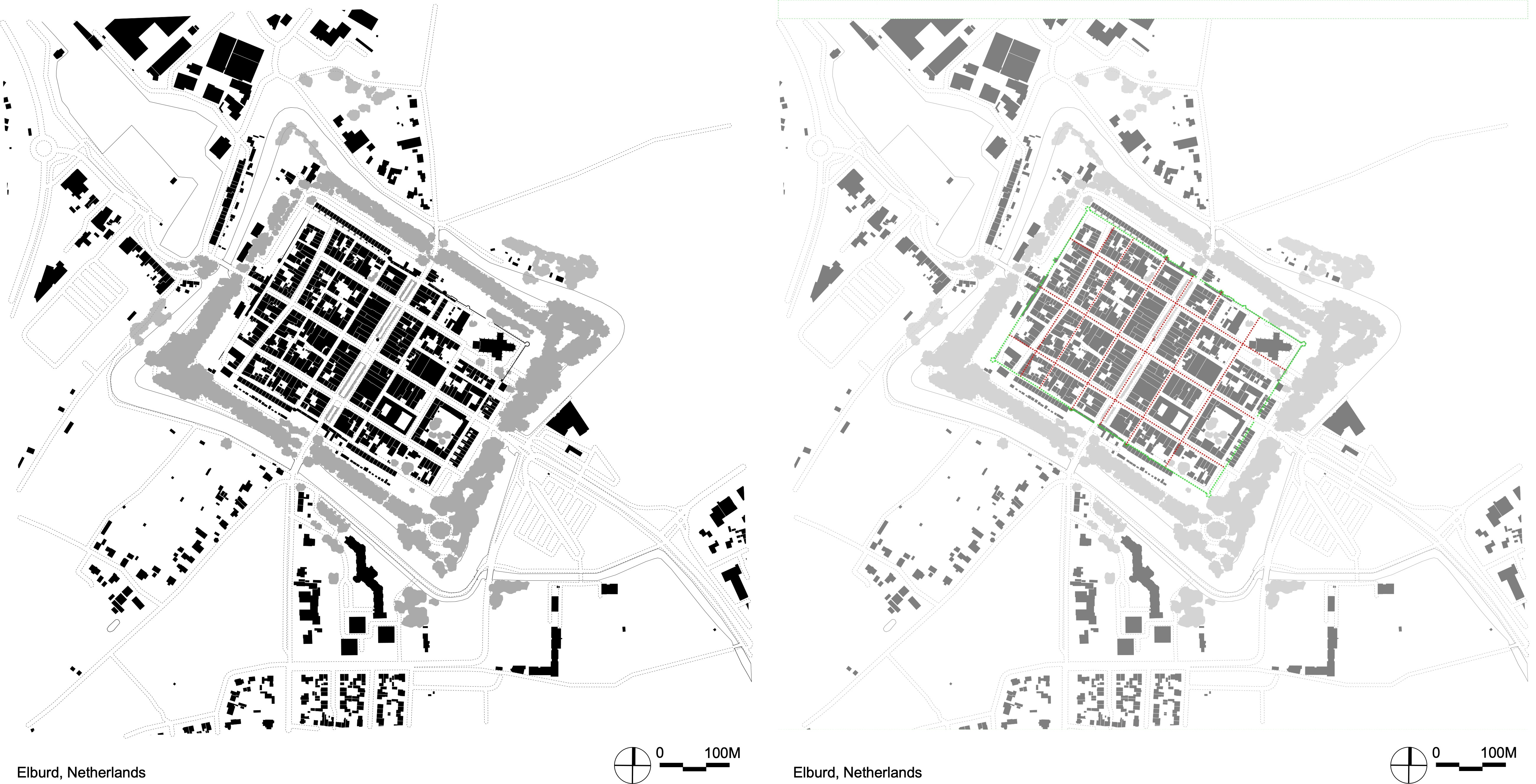 In all three of the examples the rectangle, and Cardo and Decumanus, should be apparent.