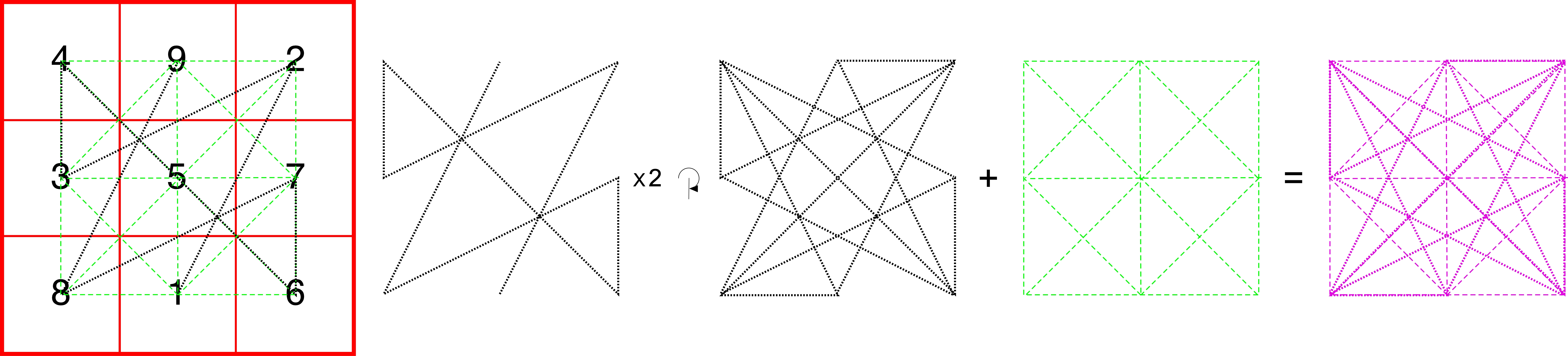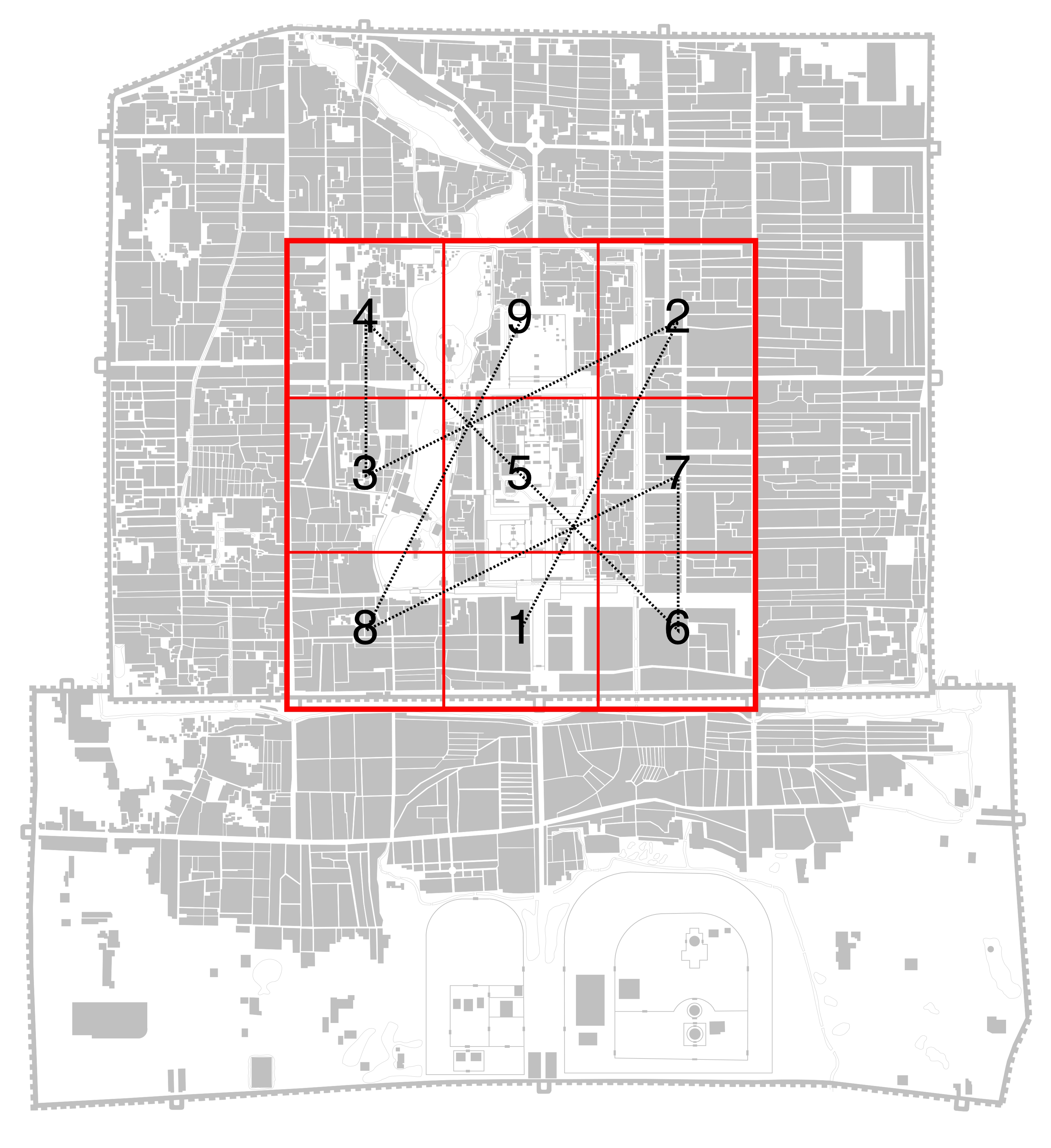 In ancient China the Hung fan, or the ‘Great Plan’, specified the five elements and the five numbers which the (mythical) dynastic emperor Yü received from heaven. Yü then measures and the divides the earth into nine regions, or one square divided into nine sections. This diagram underlies much of Chinese divination and remains a staple of Chinese surveying town plans.