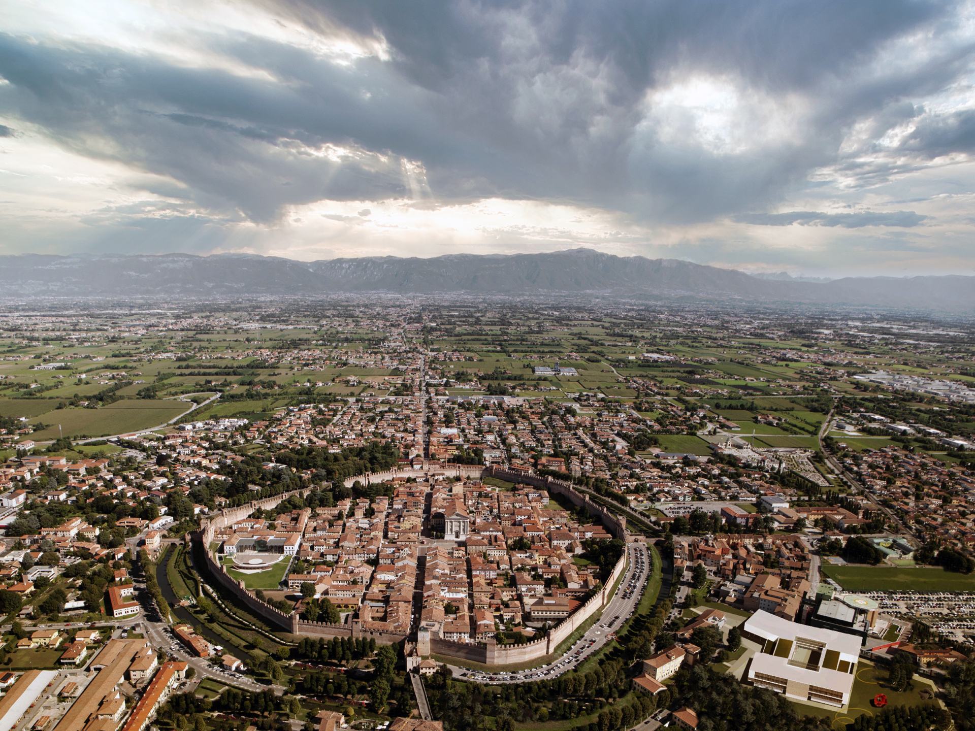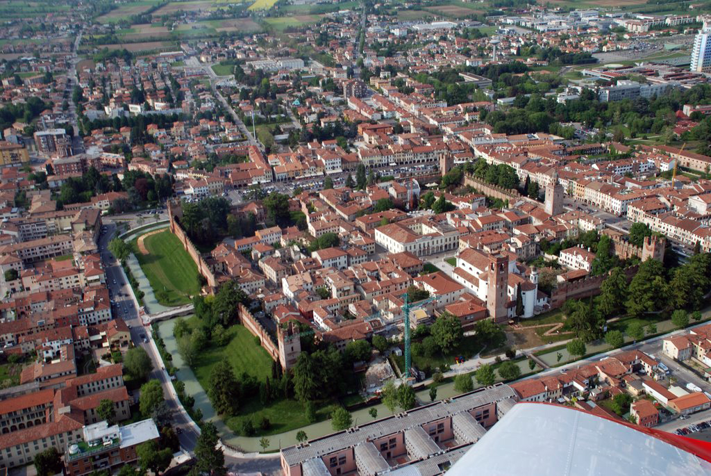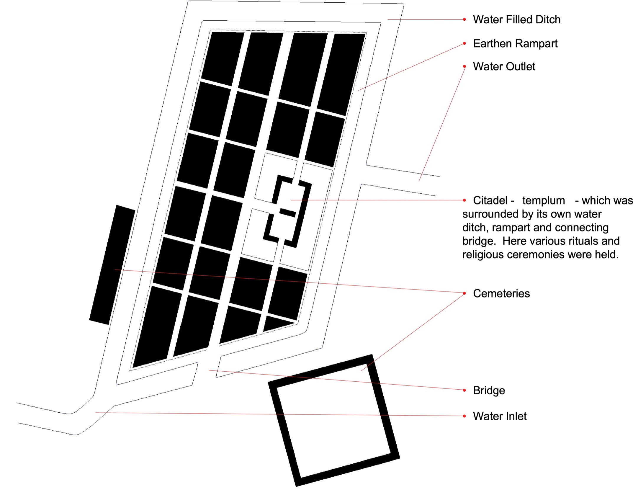 The grid design is usually attributed to the Greek town layout, but it is known that in the Bronze Age, circa 1400-800 BC, in an area between Po and the Apennines there existed more then 100 settlements. One of the largest of these was Terramara of Castallazzo di Fontanellato, located just west of Parma. This village was rectilinear in shape, had a grid plan, and had two major cross streets with an internal open area that is similar to the forum found in the later Roman legion towns.