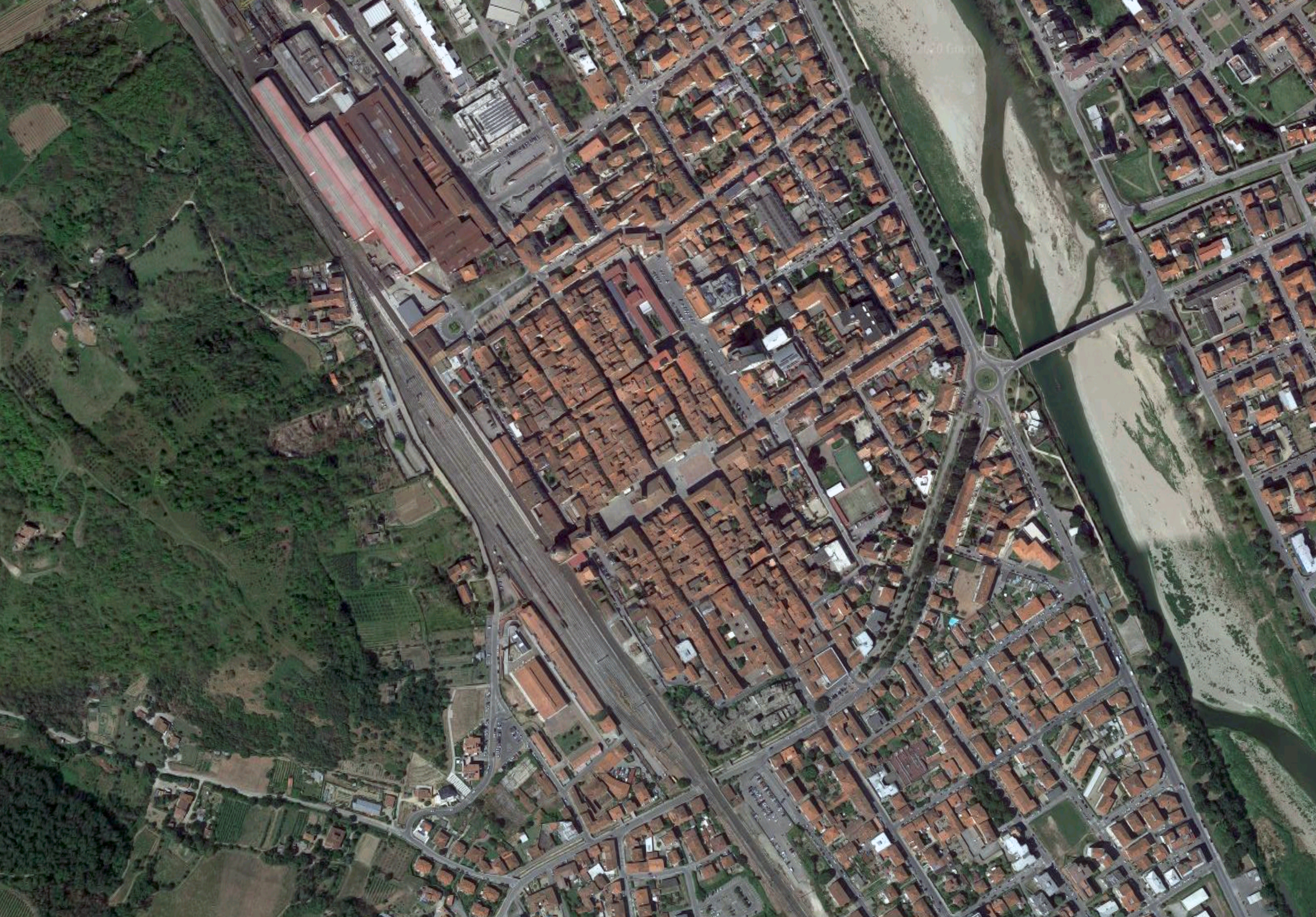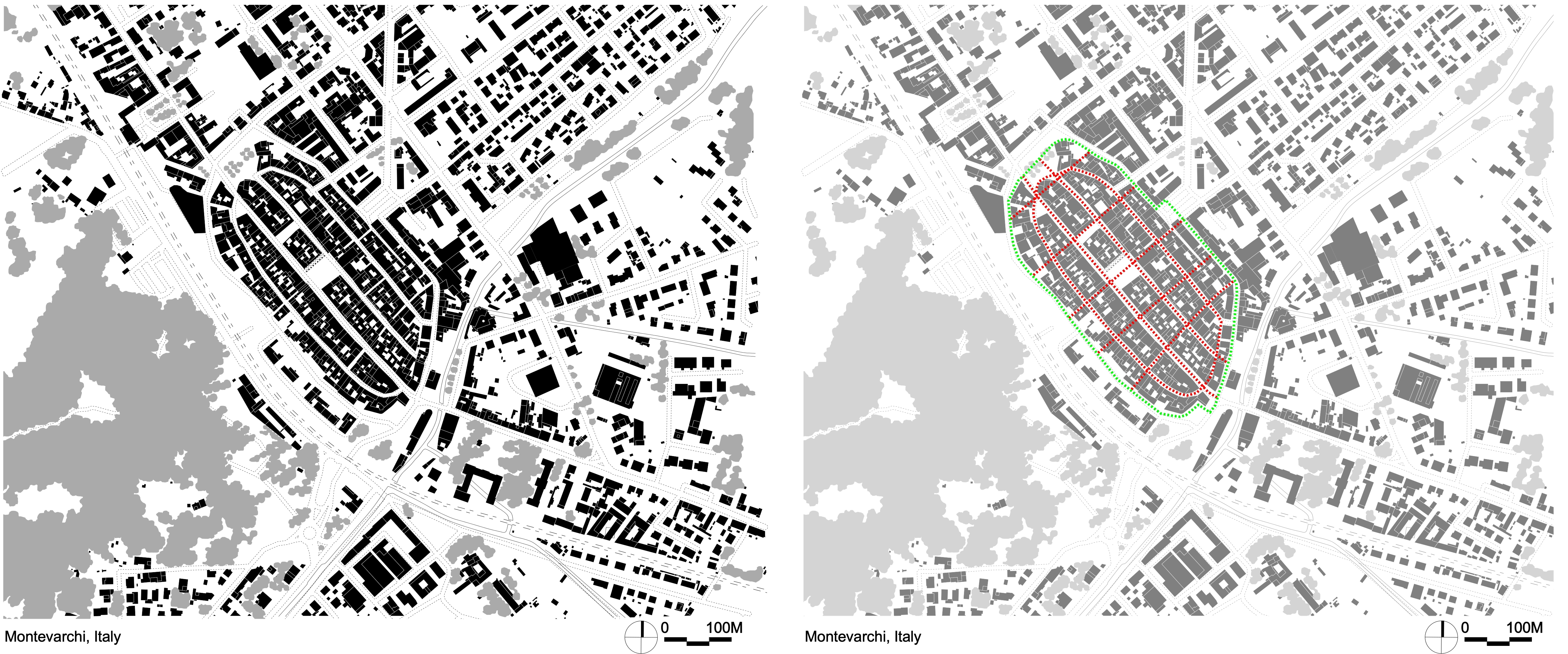 The actual rectilinear form was not always followed as a strict guideline though. The layout did not always follow a true north/south grid, and at times, due to either building on an existing town or an uneven layout of the land, the town structure would appear almost amorphous shape. As shown in the illustration of Como, the town conforms to the water edge, and as shown in the illustration of Arezzo, in some cases an arises due to the layout of the land.