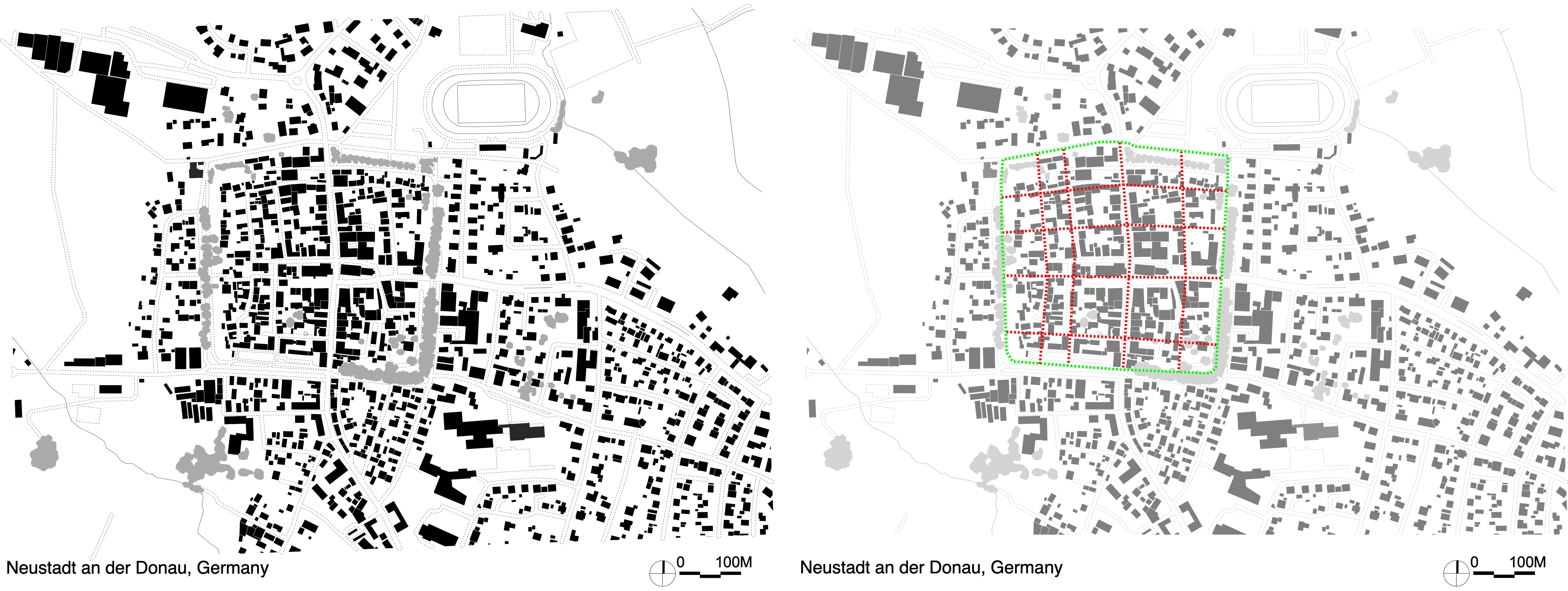 “In most of the plans of newly founded towns of the period, one can recognize an inclination towards regularity and orthogonality. It is obvious that there must have been a very basic idea of geometrical order behind this, involving straight lines, right angles, equality of distances and often even symmetry. Some scholars believe that plans which are more or less regular have been laid out by use of very simple geometry, by setting out straight boundaries at regular distances that were determined as rational, mostly rounded, numbers of the then current units of measurement. This is called ‘arithmetic design’ or ‘simple geometric design’. Scholars have tried to reconstruct specific cases of this method of design on the basis of measurements taken from specific town plans (either in reality or in more or less accurate plans on paper).