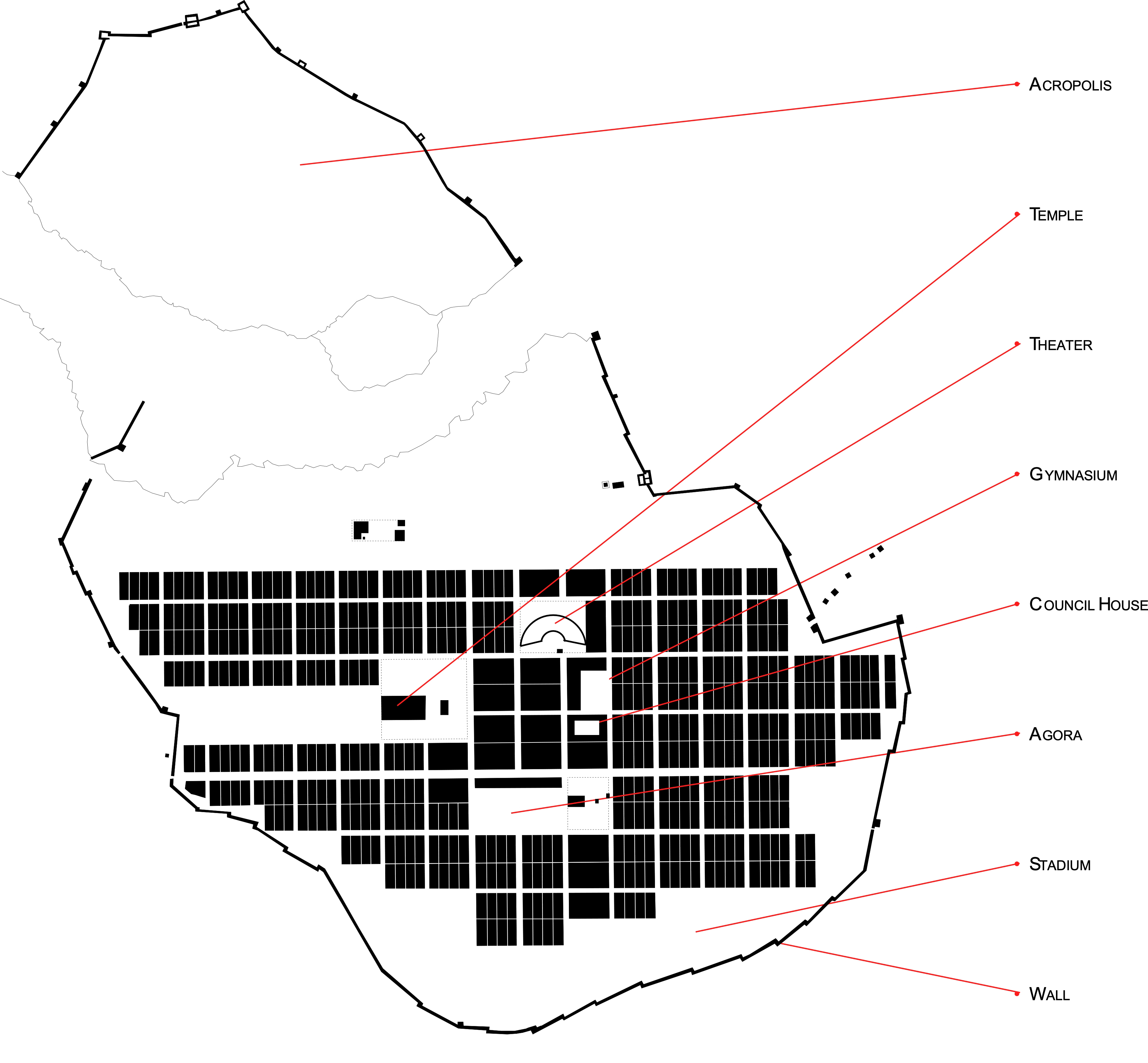 There are generally two types of Greek city forms, the parent free form type and the colonial city. Typically, both parent and colonial cities had central areas, an Acropolis, located on a raised or plateau, which presented a natural fortification. These sites, classically located on a natural rock citadel, contained a place for temples, but also offered a place of refuge if the area were attacked. Around the plateau houses would be built spreading outward from the rock fortress. Characteristically in a desultory pattern for the parent city, and in a structured pre-laid out grid for the colonial town. Eventually a surrounding wall would be built, and the settlement became a fortified town. “The Acropolis was seen as the core of the town, and the town was (seen as) the core of the city-state, which included both town and country.”[4]