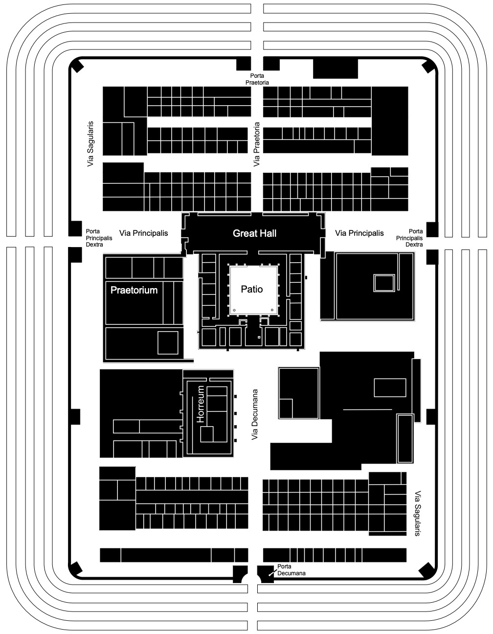 Too fully understand the mentality towards the layout of Roman legion towns it is important to understand the symbolism of their beliefs. The Romans, as early as the Etruscans, believed that the heaven was divided into four parts by two axes crossing each other at right angles. The diagram for this division was called templum in Latin. The two main intersecting lines were oriented towards the four cardinal points, with the north south called cardo and the east-west lines the decumanus. A city conceived and laid out according to the templum was not considered an ordinary place, but was considered sacred, and any city built was done so along these sacred principles.[5]