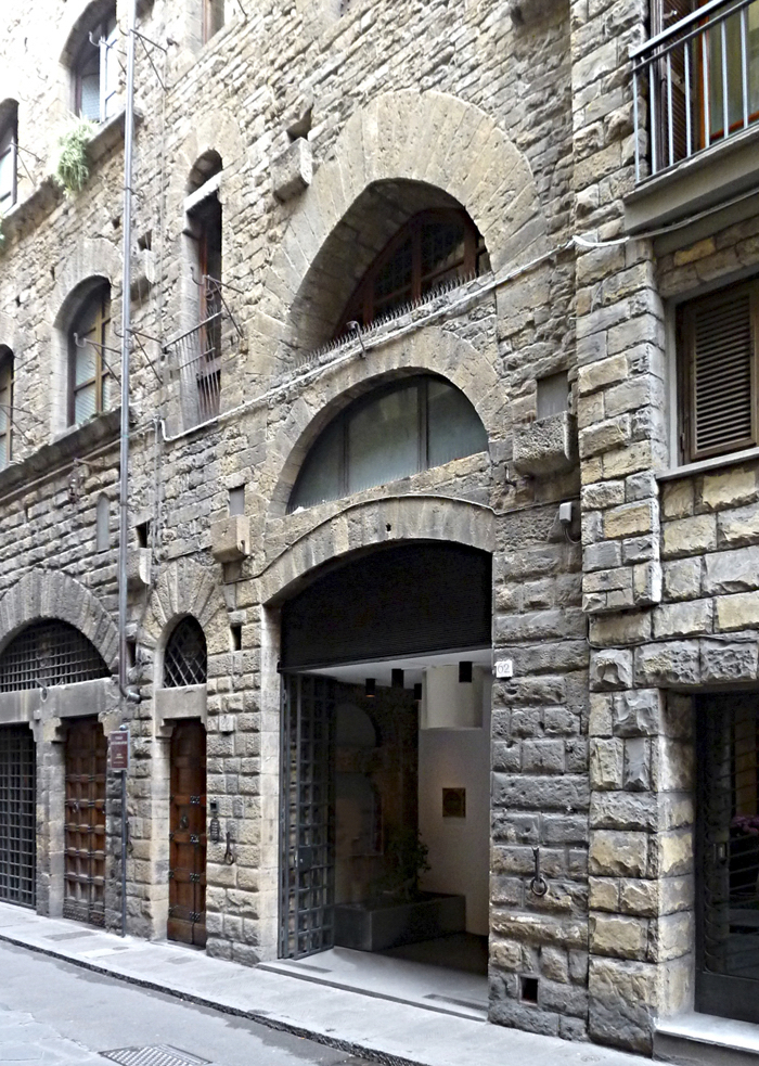 At the ground-level entrances it’s common to find massive arched entrances, with small, punched windows, as seen in the photo below.