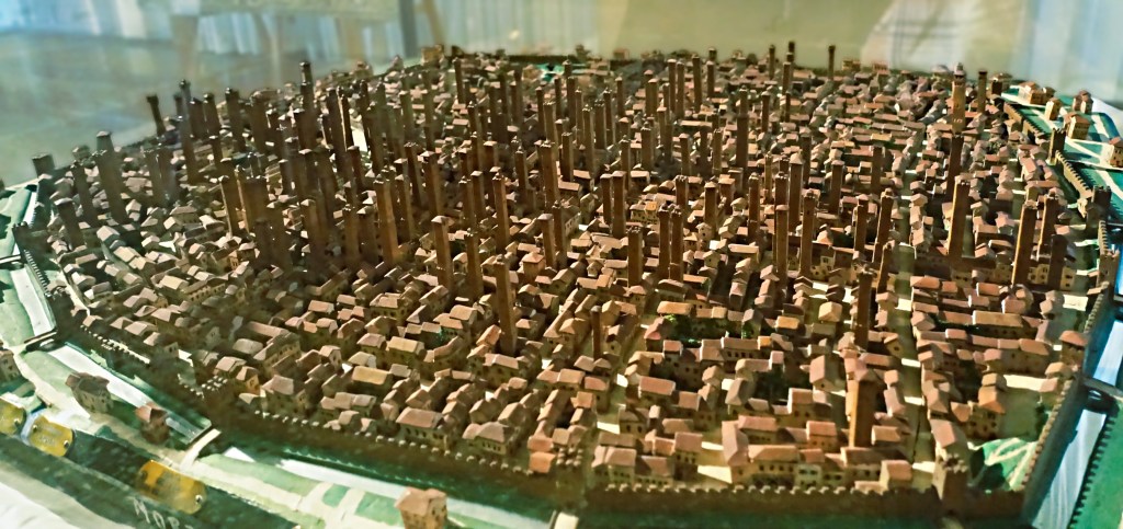 As the wealth and power of Tuscan cities grew in the Middle Ages, it began to attract powerful families from outside the walls, and when they settled within the cities, they brought with them the defensive architecture that kept their enemies at bay in the countryside: walls, battlements, and towers. Effectively, they created private urban castles. Unfortunately, these families also brought with them the culture of the blood feud. These feuds at times erupted into fighting, and once ignited, this factionalism spilled out into full-scale warfare between the power blocs of the various families, which drew cities across Italy into pitched battles. Out of three of the towns mentioned above, only San Gimignano and Bologna have retained at least some of their original medieval towers. San Gimignano has conserved 14 of the original 72 towers, while Bologna retains a handful of the purported 100+ towers that once controlled the town’s skyline. In the 13th Century, when Florence became a republic, all the towers were cropped to signify that the age of clans and civil wars was over. The Florentine historian Giovanni Villani (1280-1348) wrote in his history of Florence, Nuova Cronica, that in 1251 the city government decided “…all towers of Florence – and there were in big number with a height of 70 meters – to be cropped down to 29 meters or even less; the stones from the cropped towers were used to build houses in Oltrarno…”