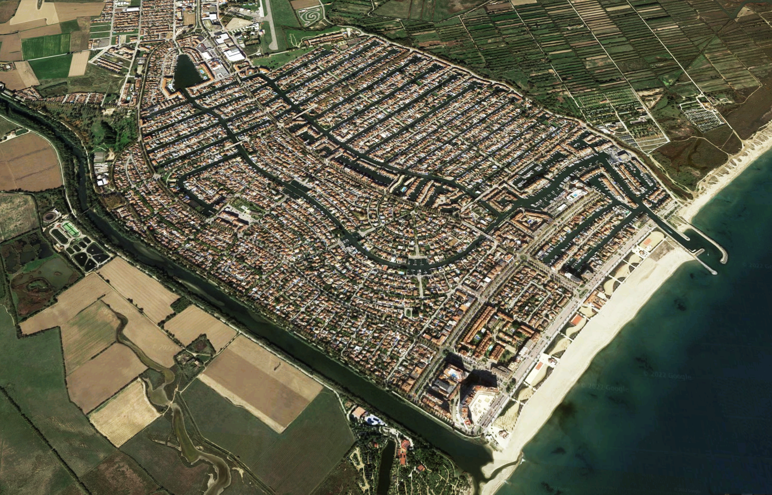 Originally built on a swamp, Empuriabrava was transformed into a tourist community, initially planned in 1964 and completed in 1975. The town has more than 40 km of canals and a seasonal, summer population of around 80,000.