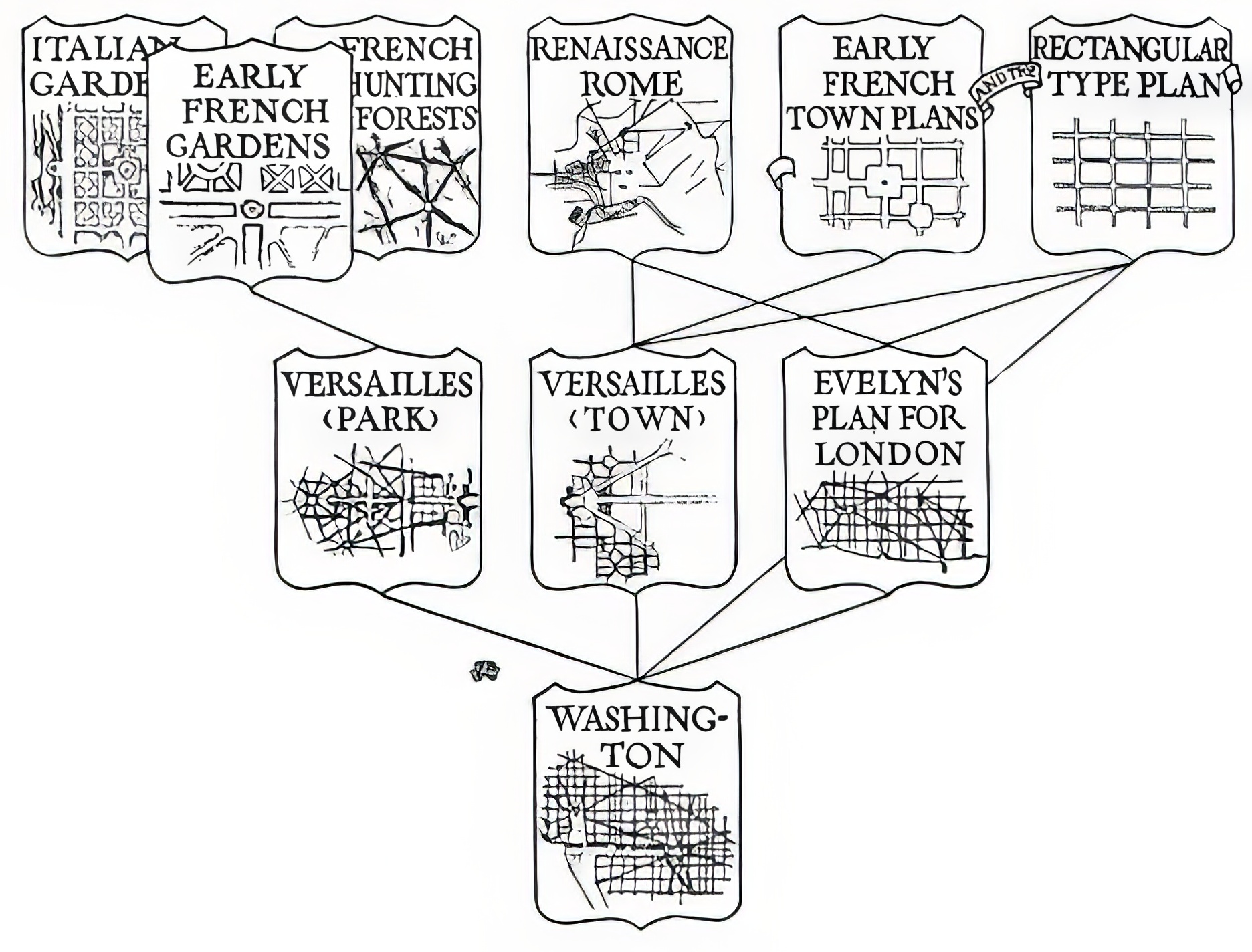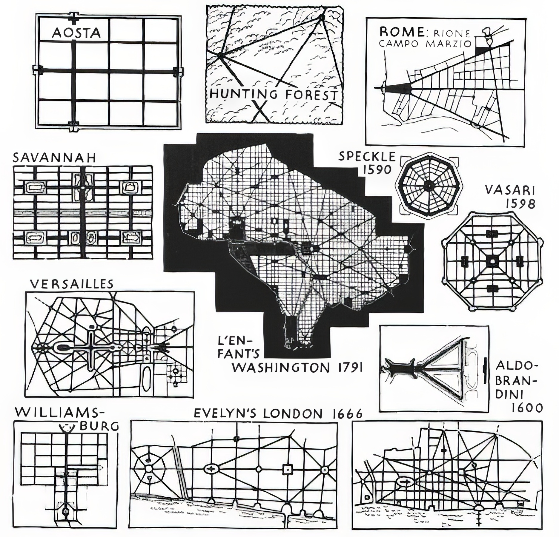 Twenty years after my time spent at Cornell I began writing the Genealogy of Cities. Early on I came across two articles in two different journals, by Elbert Peets, and bothtitled “The Genealogy of L’Enfant’s Design of Washington,” In these two articles Peets traces the historic architectural and city scale fabric which he considers as a precedent for L’Enfant’s design of the USA’s capital city. Peets’ genealogy attributes L’Enfant’s direct influences as Versailles and John Evelyn’s plan for the re-building of London after the fire of 1666. Peets’ drawings compare streets, relationship and distances of triangles, and scale comparisons of building fabric and Peets further traces the genealogy of Washington D.C. outlining Roman legionary camps, hunting forests, and early French town plans. Through this means of genealogical analysis the observer can see a portion of the design process that may have influenced L’Enfant’s design for Washington D.C. Peets’ process of tracing the genealogy led me to consider the possibility of a pattern or typology for city designs, and eventually to the researching and writing of this book and a further understanding of collage at a city scale.