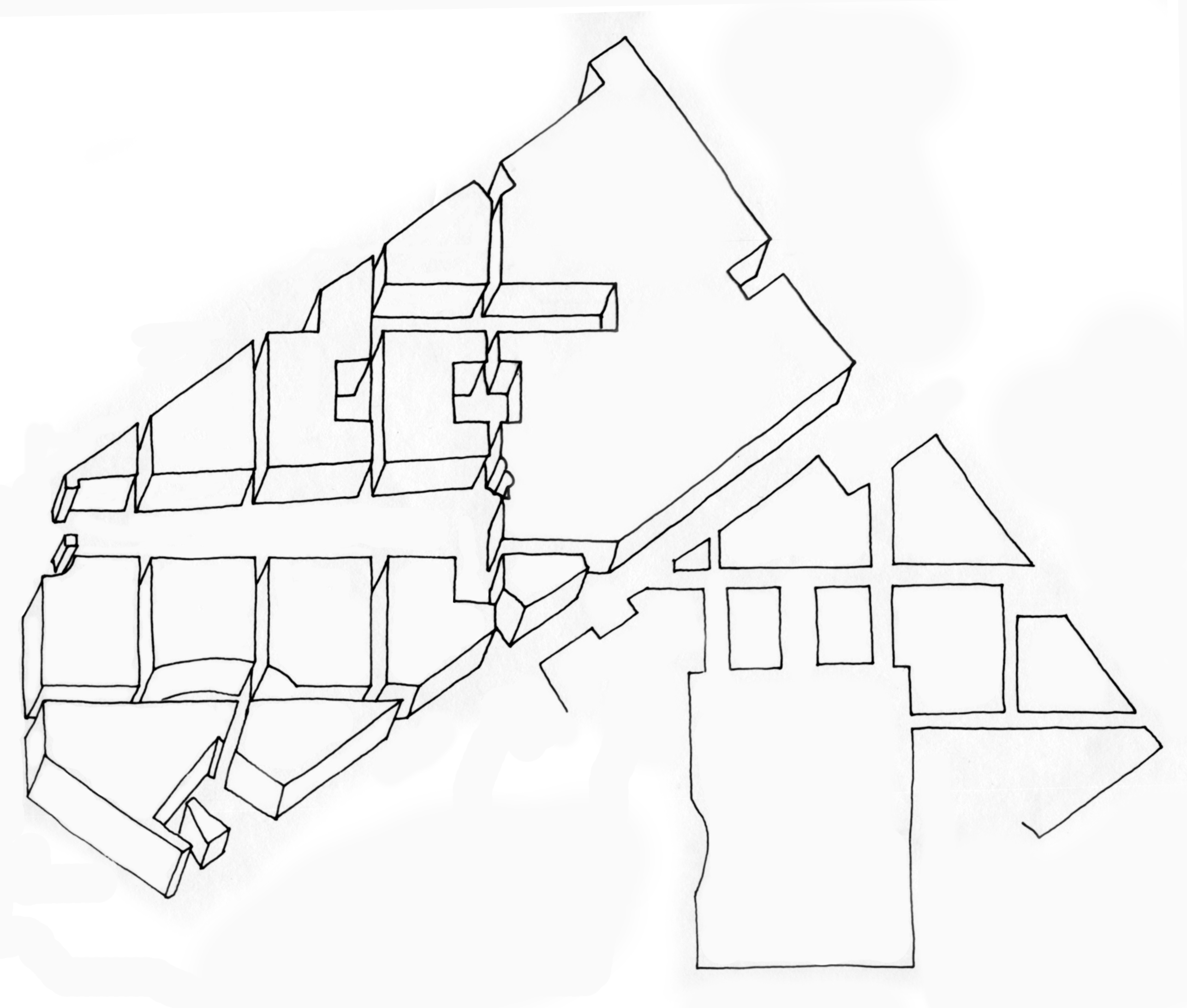 At the desk crit Rowe sketched the following, and during the critique mentioned the phrase “Fat City.” I took this to mean ‘designing with subtraction’ instead of just ‘designing with addition,’ and the process led to this next drawing, Ciudad Gorda.