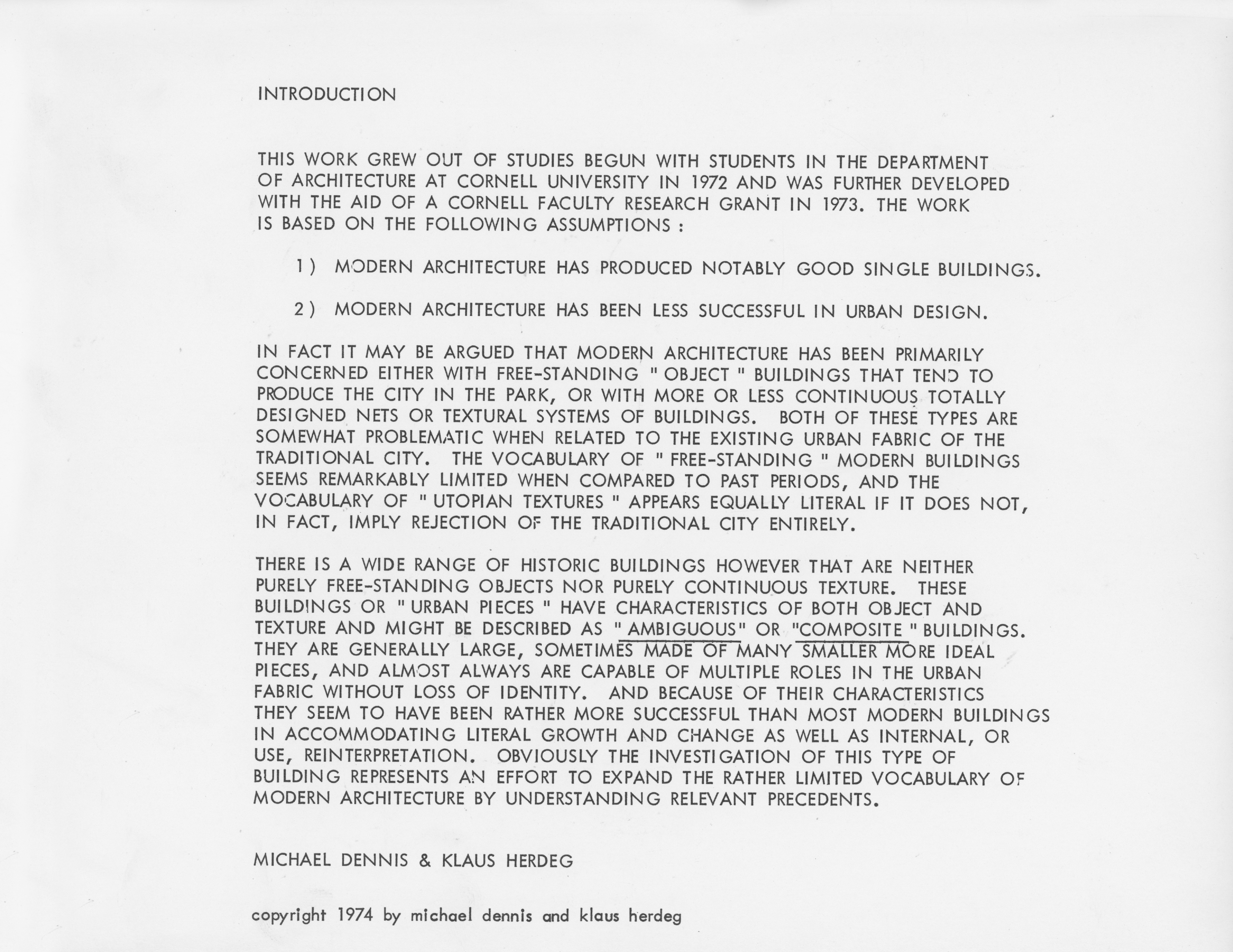 In the architecture Cornell Journal, Issue #2 Steven Hurtt writes an article titled “Conjectures on Urban Form.” In the introduction for his article the following is written,