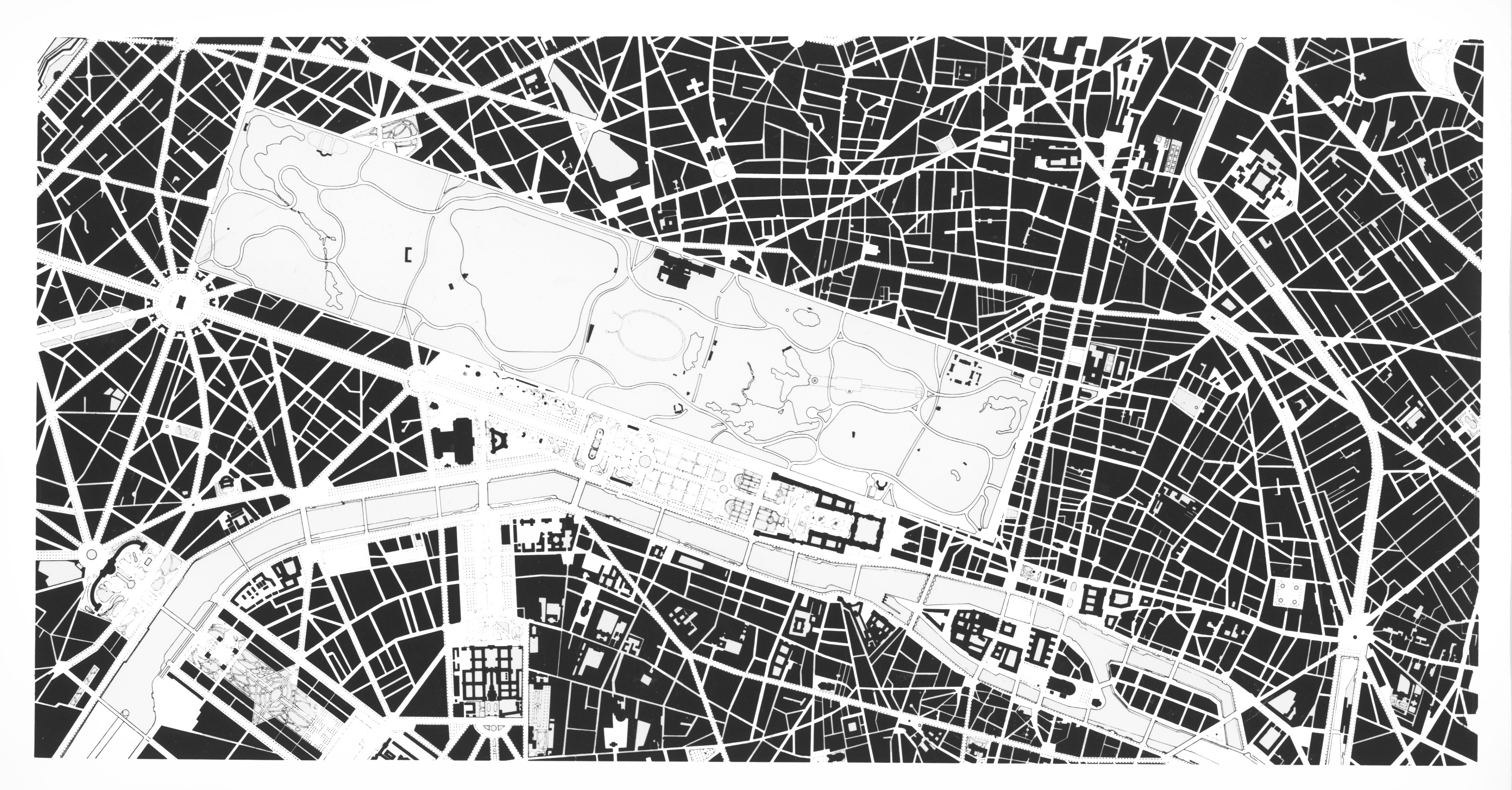 After placing central park to the side as a scale comparison I then collaged central park onto a series of plans. An example, central park collaged onto central Paris. (Plate #37 – Collage of Paris and Central Park)