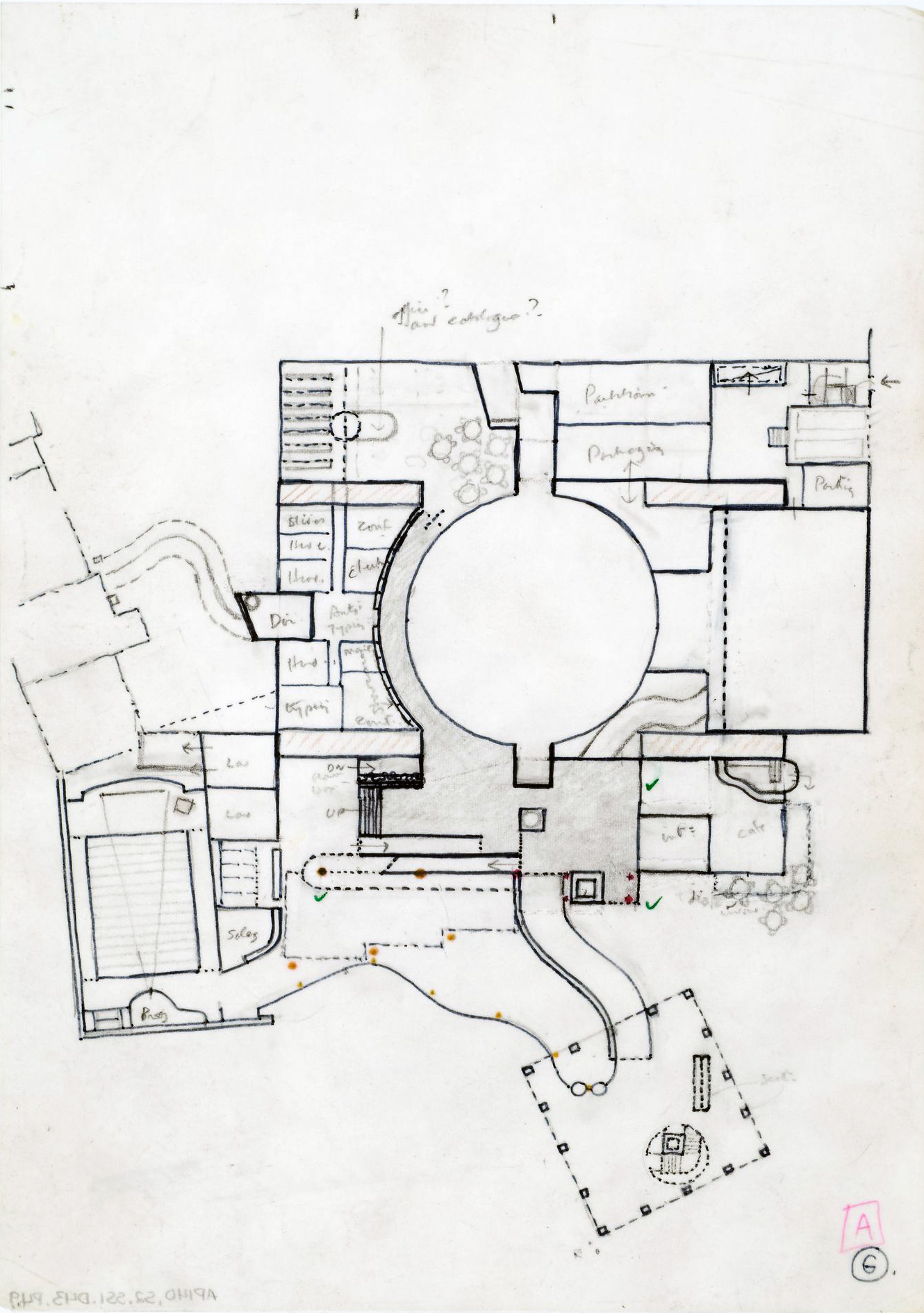 The two images with the red dots were sketches on trace paper by Rowe, with the final design represented below.