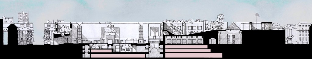 In the 3rd year undergraduate architecture program, the students are introduced to urban design in their spring semester. The first image below is of a final project, and the second image illustrates poché ‘fields,’ indicating various programmatic areas.