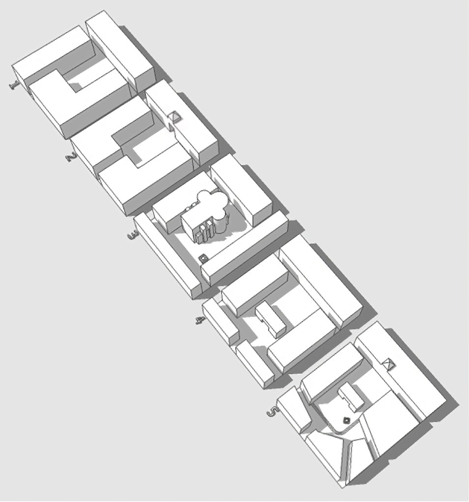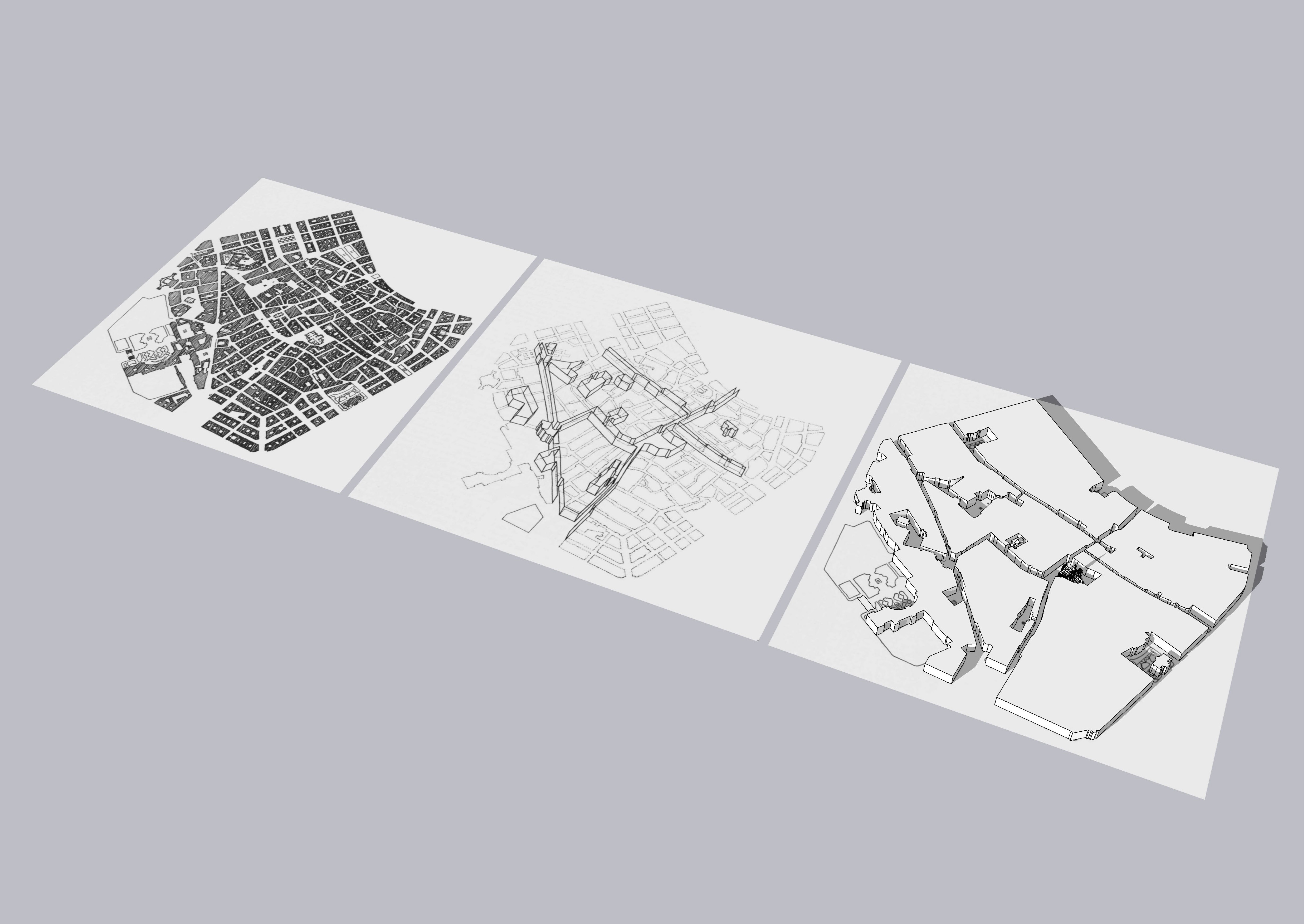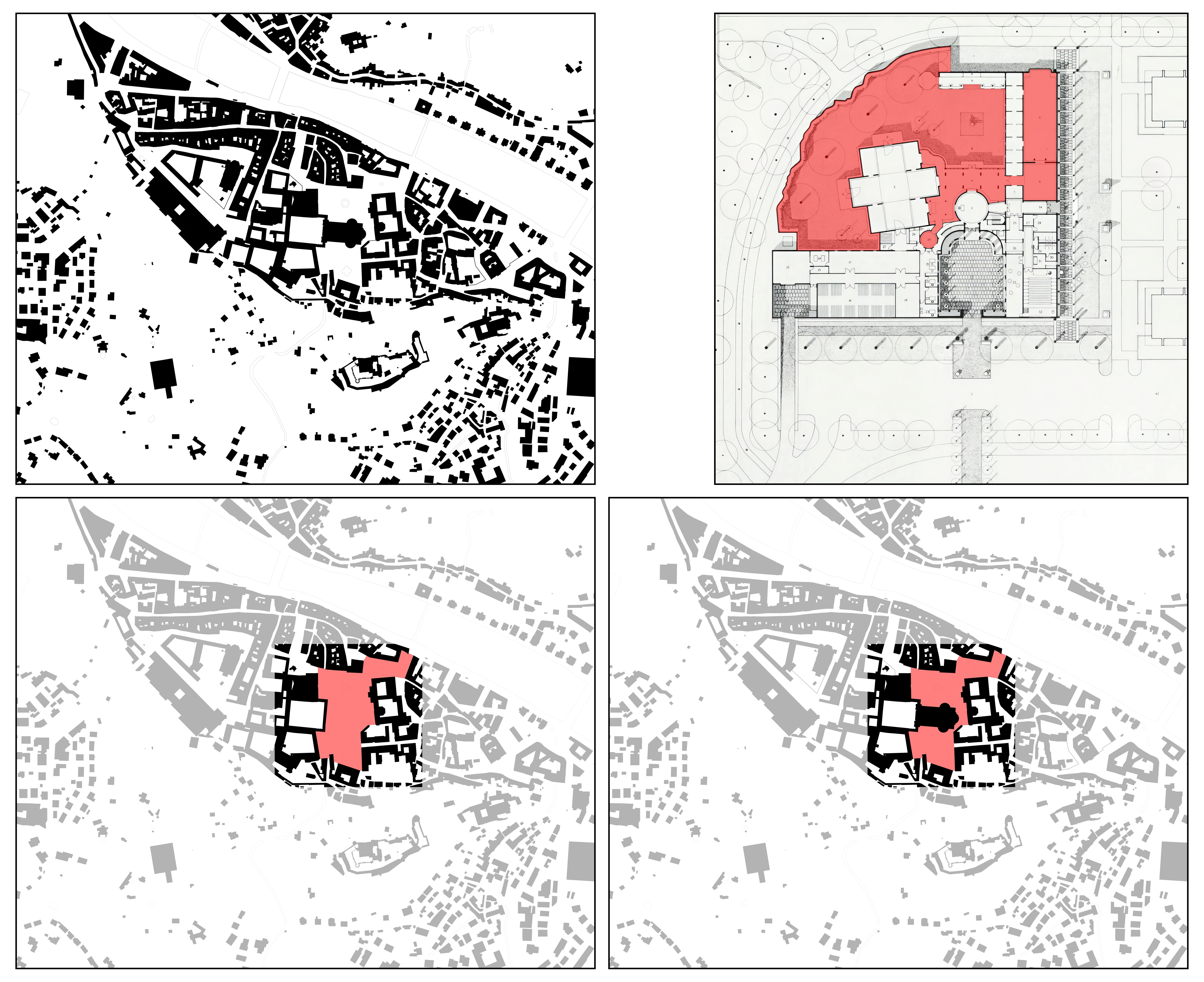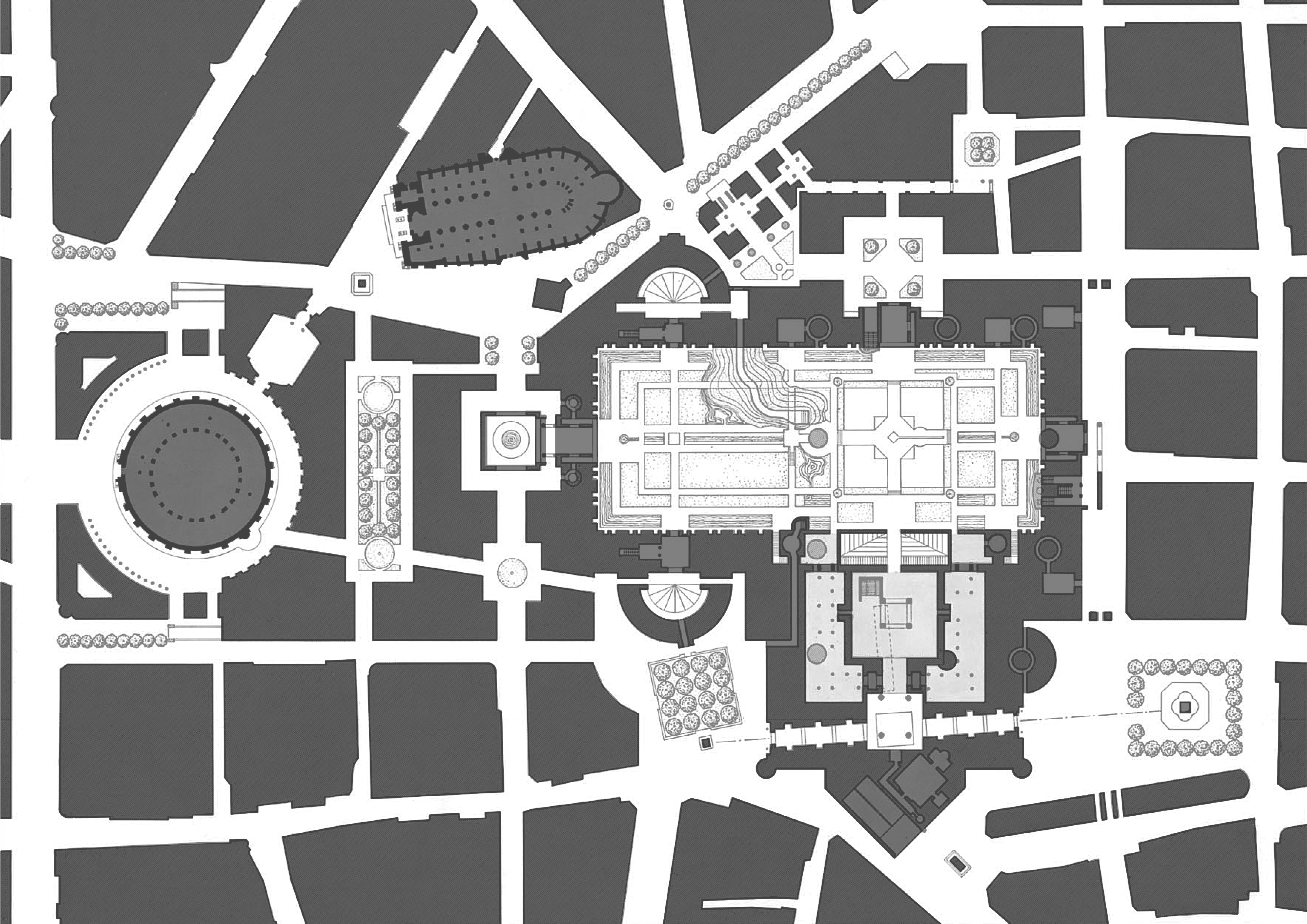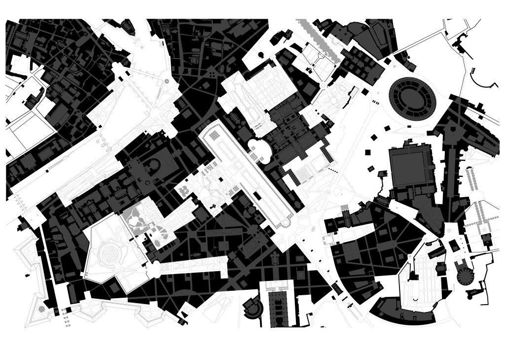 With the publication of Collage City8 in 1978, the concept of the Urban Design Plan Game was reintroduced as a design tool. At the beginning of the book Collage City David Griffin and Hans Kollhoff created a fictitious design by collaging various plans of different buildings. They called this The City of Composite. By shading the fabric, the poché appears.