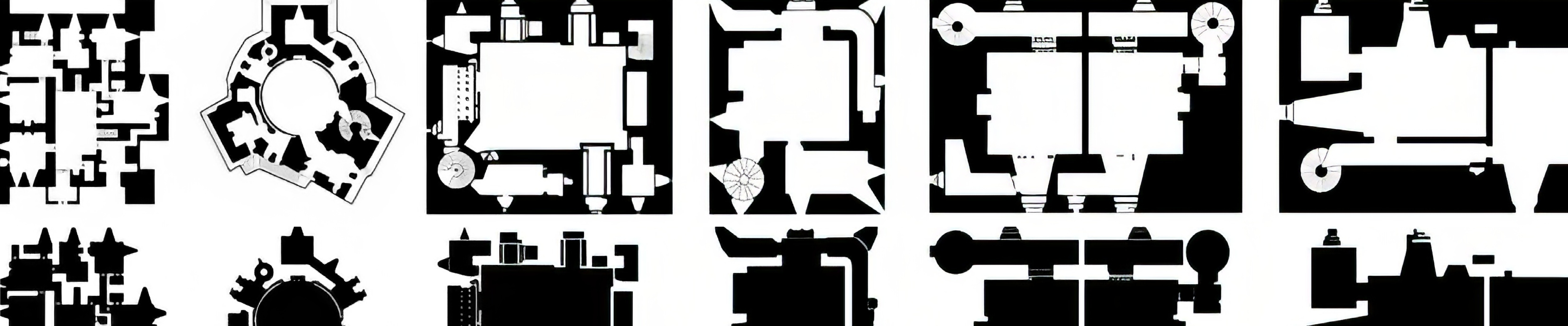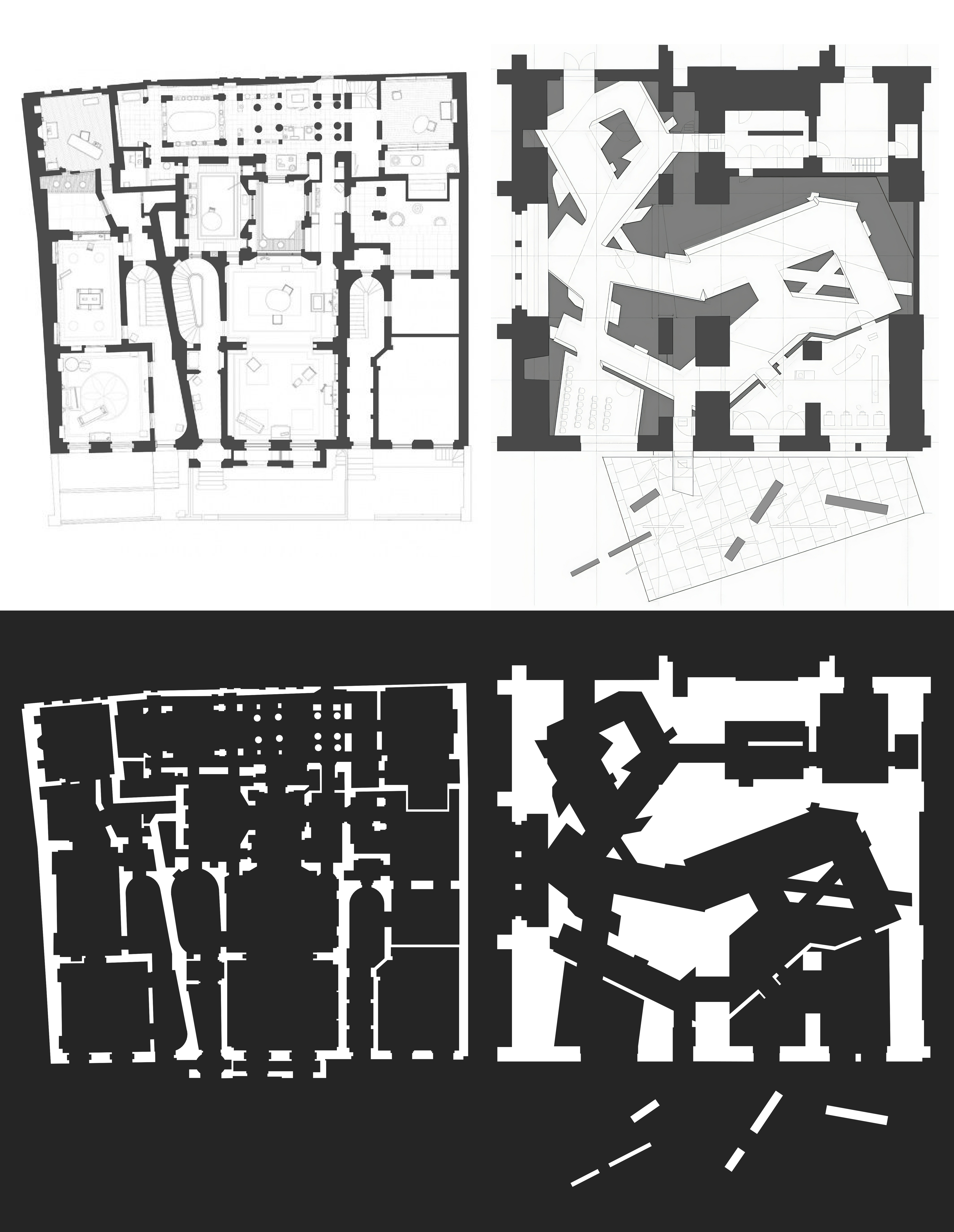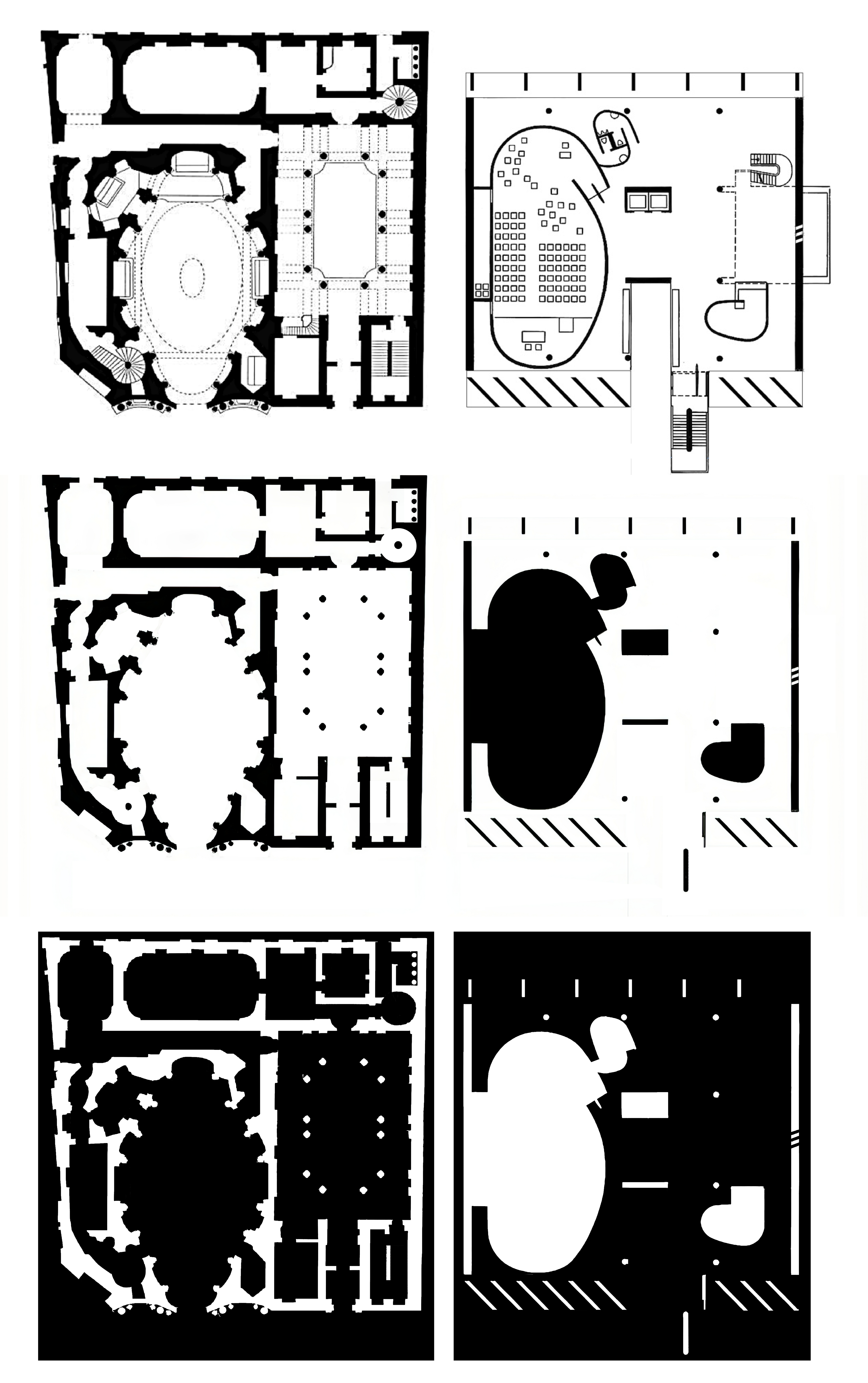 Examples of solid negative space represented in the plans of castles and keeps. The first example illustrates both the walls as solid poché and then the second line illustrates positive void space reversed as solid poché.