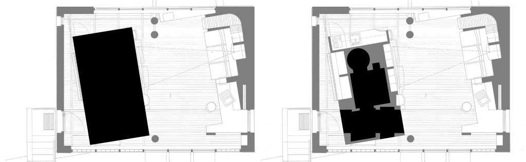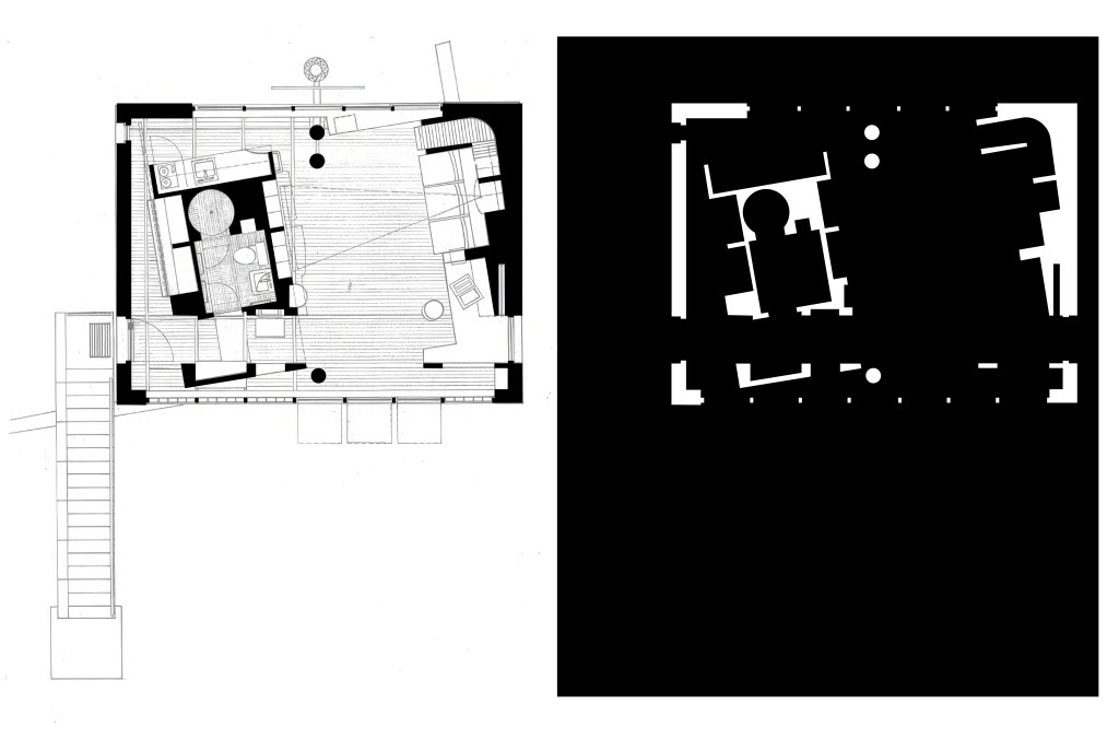 Shown here are examples of a combination of all three types of spaces: ineffable space, solid negative space, and void negative habitable space, within architecture. A project by Anthony Ames’, his Garden Pavilion, located in Atlanta, Georgia, USA 1985. In figure 3 the solid negative space is shown on the left, with the reverse on the right. In figure 4 the ineffable space is shown on the left as a solid rectangle floating within the open plan, while on the right the figural void negative habitable space is shown within this solid rectangle.