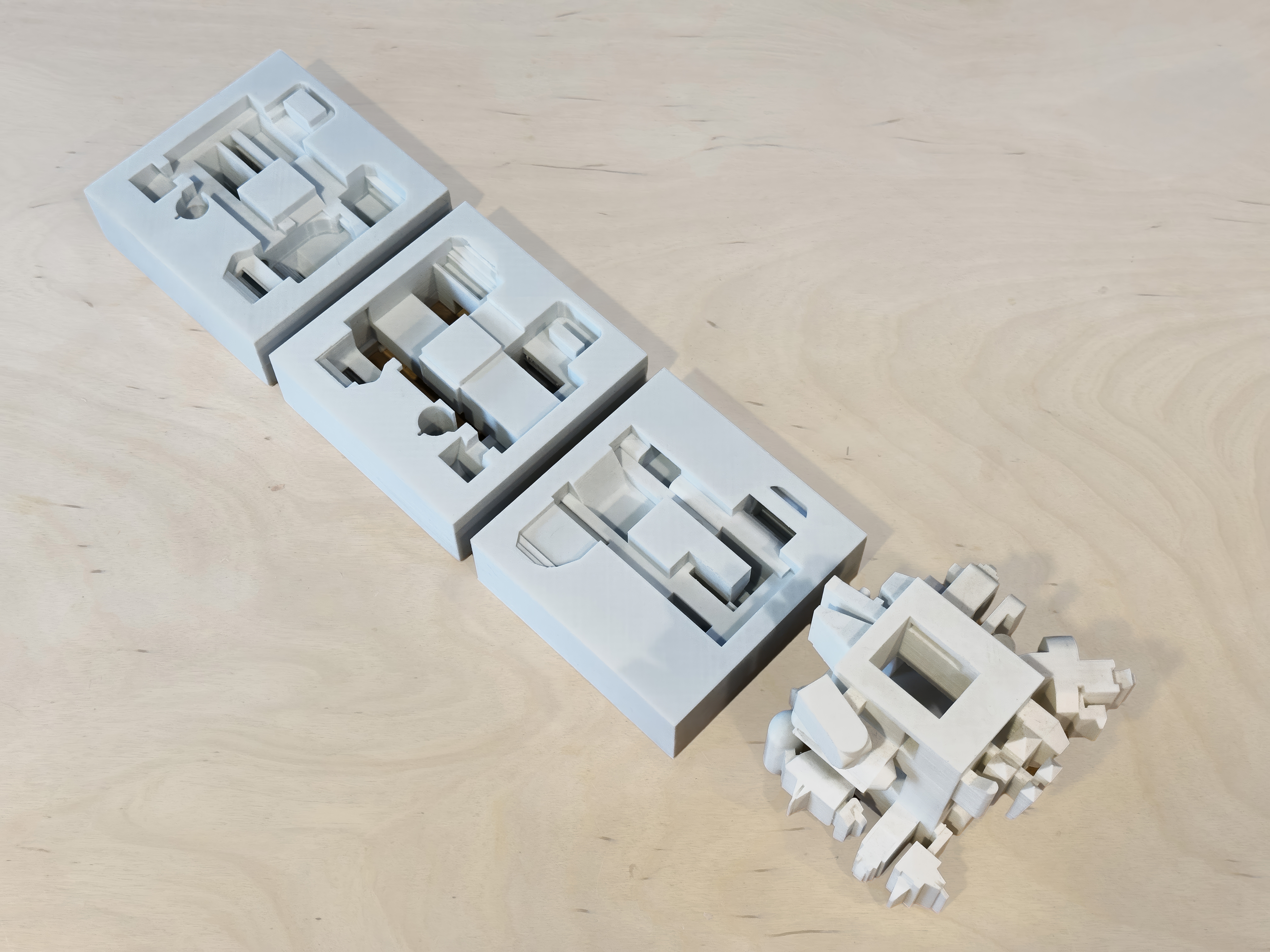 “Le Corbusier’s proposed town center for Saint-Dié, France, is a place without closure. Rather, it is an open assembly of public buildings carefully placed apart and freestanding from each other in a purposeful balance of distances. It all sits in a geometric, layered form of Anti-Space meant to be perceived in motion along the riverside site. Note that the Anti-Space sense of boundless infinite flow can exist even where everything is on the same geometric orientation. A key question is how could Saint-Dié have grown? Any change to the center or additions onto the surrounding site would damage the composition.” 7