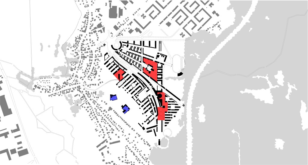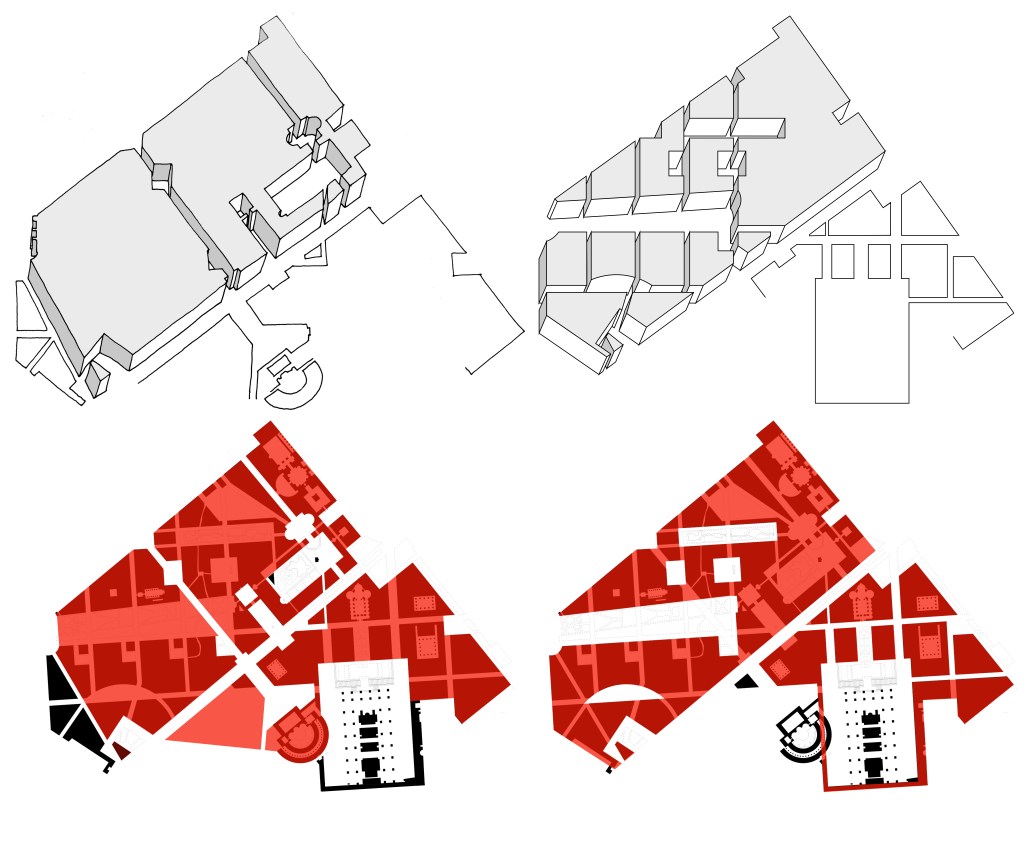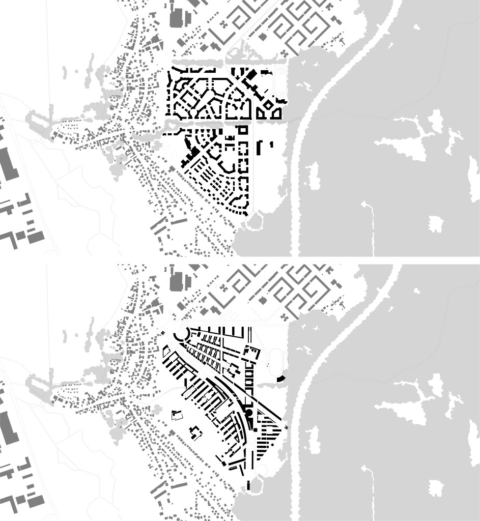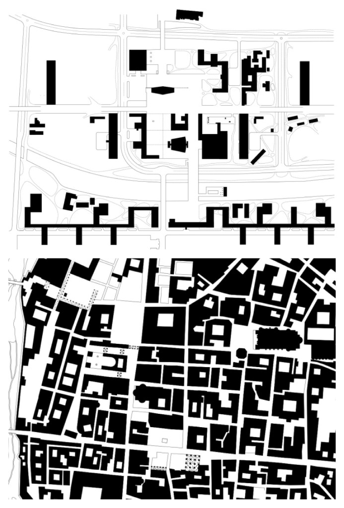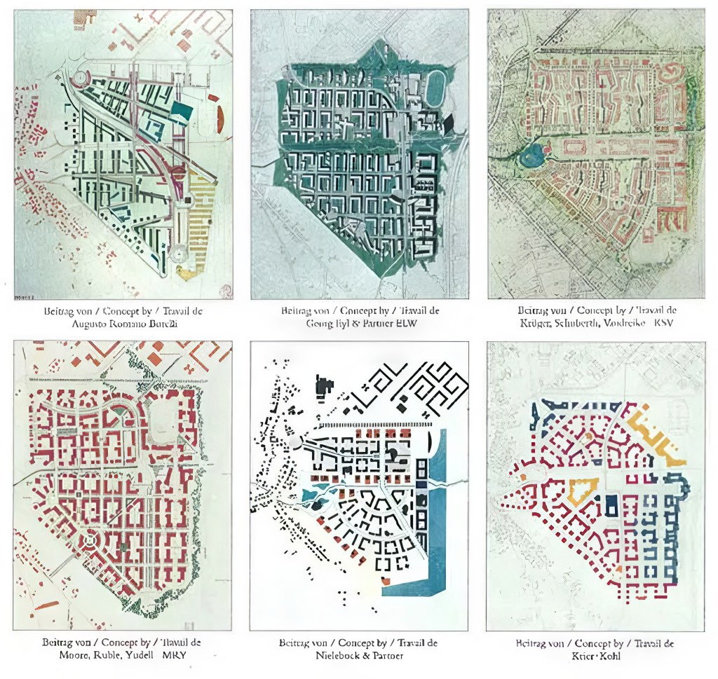 Of the six designs 2,4,5 & 6 tend to be similar their approach, 3 seems to want to be both modern, with its zig-zap buildings, but also has a semblance of a grid found in the new urbanist projects mentioned above. The first project Augusto Romano Burelli tends to stand alone and is the most intriguing in my opinion. Below is a figure/ground drawing of the final built project designed by Krier & Koll, and an early design by Burelli replacing Krier & Koll’s project.