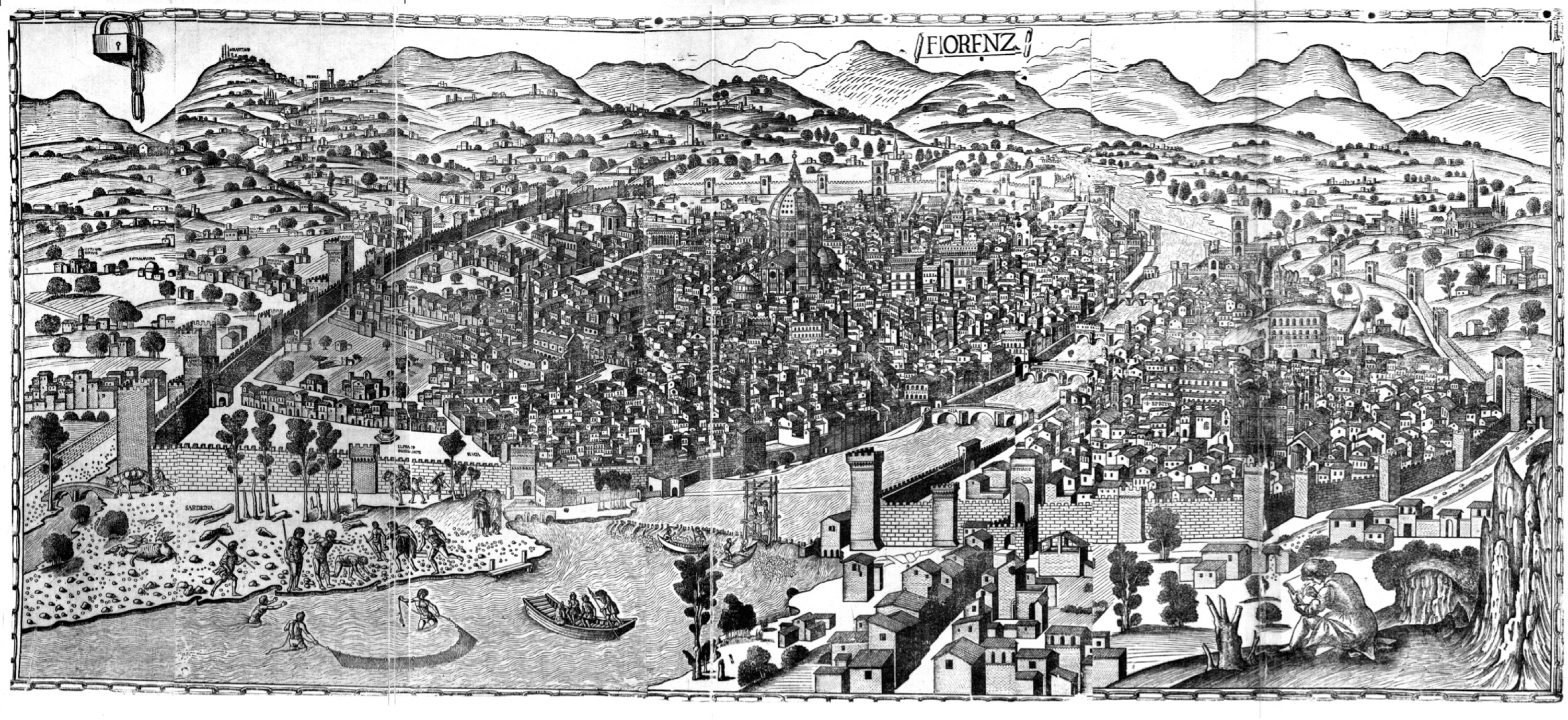 The image above of Florence today is taken from Google Maps. The view is from Giardino di Villa Strozzi. One of the hills south of the river Arno, and west of the city of Florence. The view of the 1475 print was taken approximately from this vantage point.