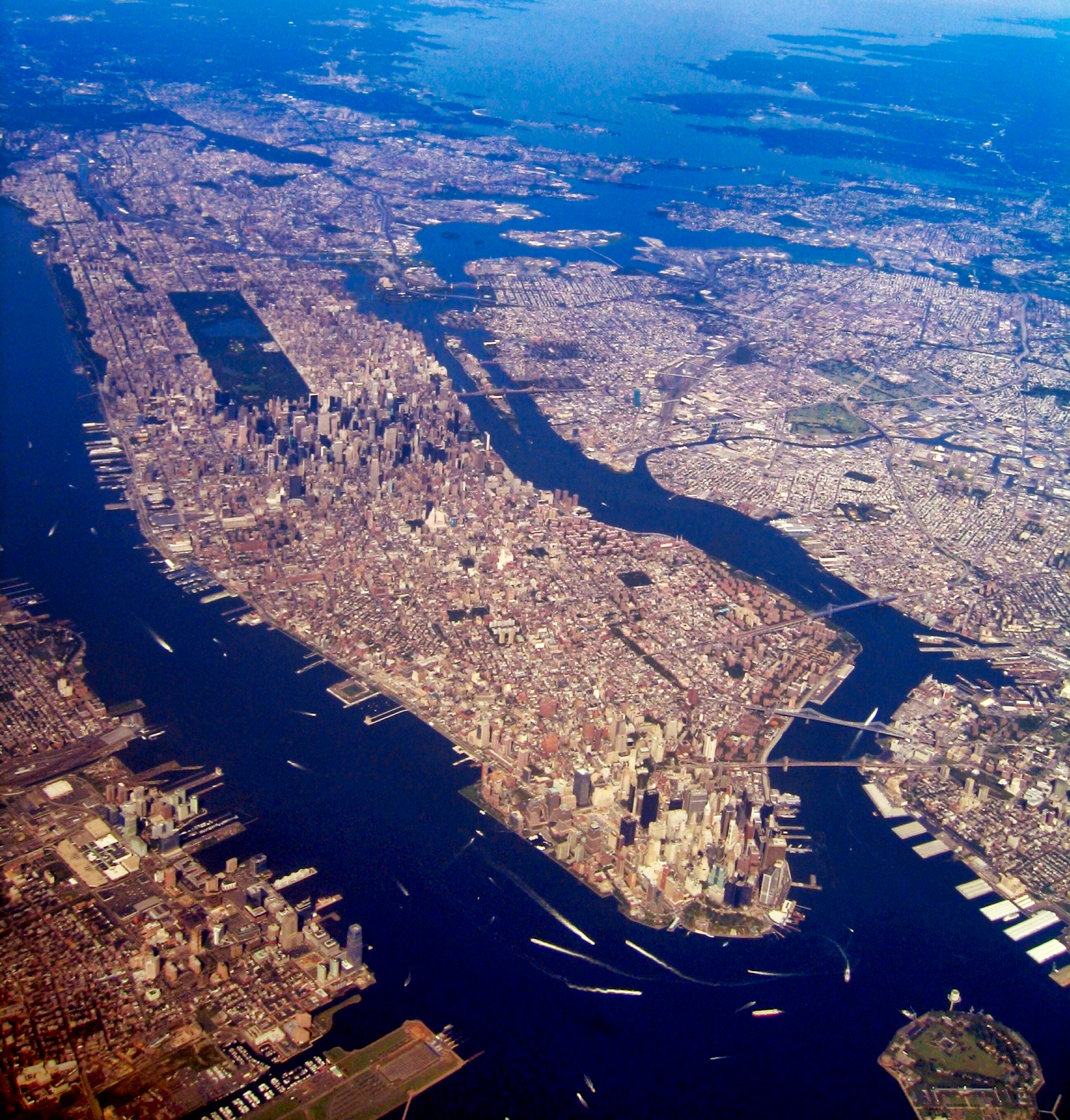 Today we are not limited to viewing an approach to a city at ground level. One of the first views of a city people see is most commonly from an airplane. Due to this, a number of cities are recognizable by key urban landmarks from the air. Shown below, an aerial view of Manhattan with its recognizable shoreline and the void area of central park.